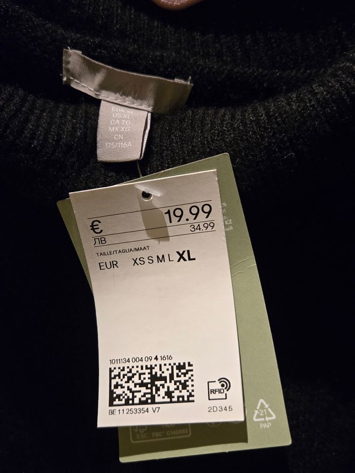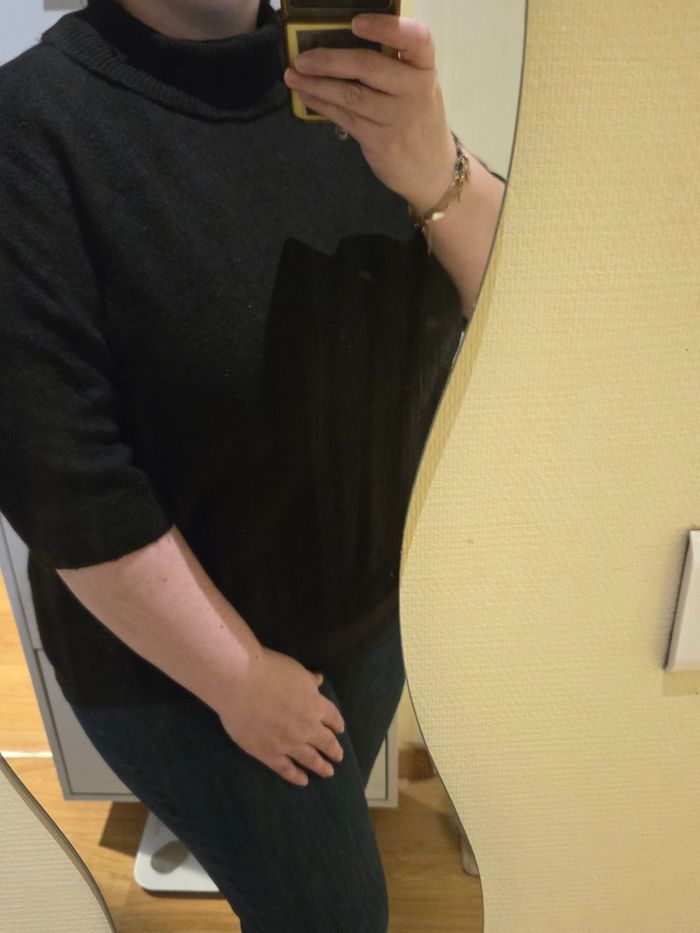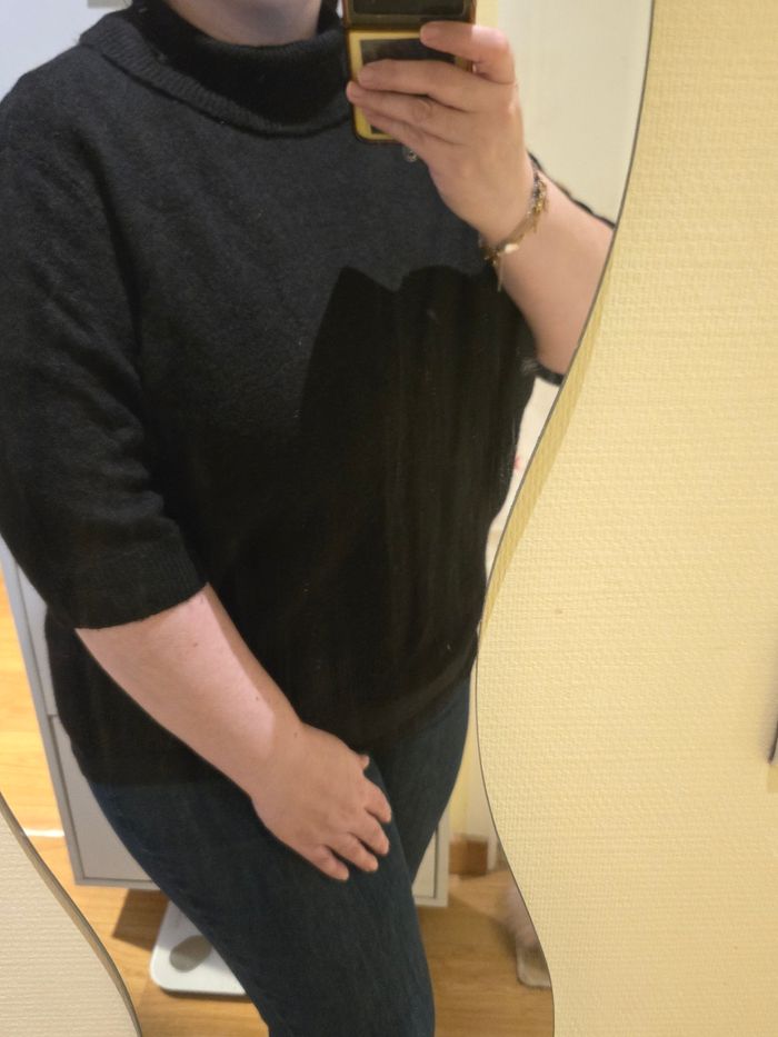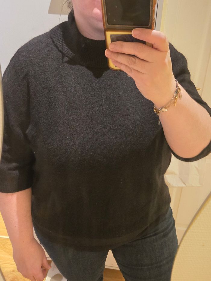 Joli pull basique à col roulé et manches courtes, noir, pour femme, neuf avec étiquette🏷. Taille : XL convenant à un 44-46 max. Matières : 52% polyester, 41% acrylique, 4% laine et 3% élasthanne. Dimensions : environ 61 cm de long, 60 cm de large sous les bras, 57 cm de large en bas, 50 cm de largeur d'épaule à épaule, 18 cm de longueur de manche, 15 cm de largeur de manche et 24 cm de largeur d’emmanchure entre l'épaule et l'aisselle. Marque : H&M. Pas d'échange, merci. Envoi rapide via Mondial Relay.