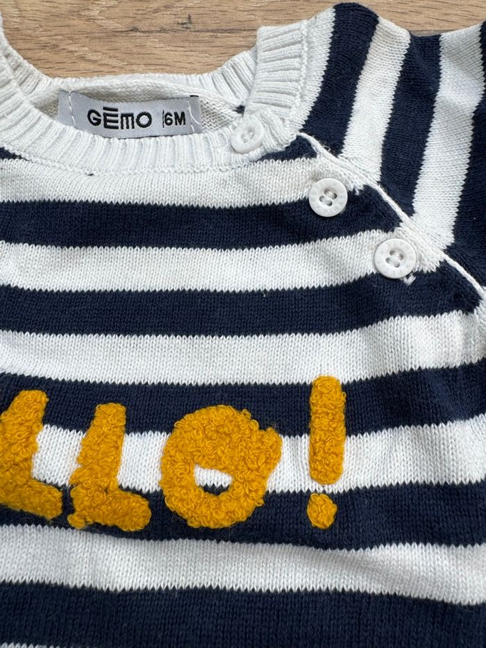 Pull 6M rayé blanc et bleu marine avec écriture hello jaune en maille bouclette + petits boutons au col écrits petit pirate
