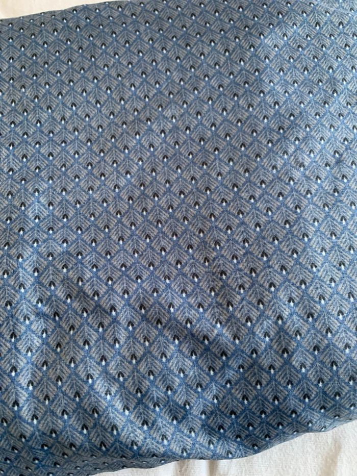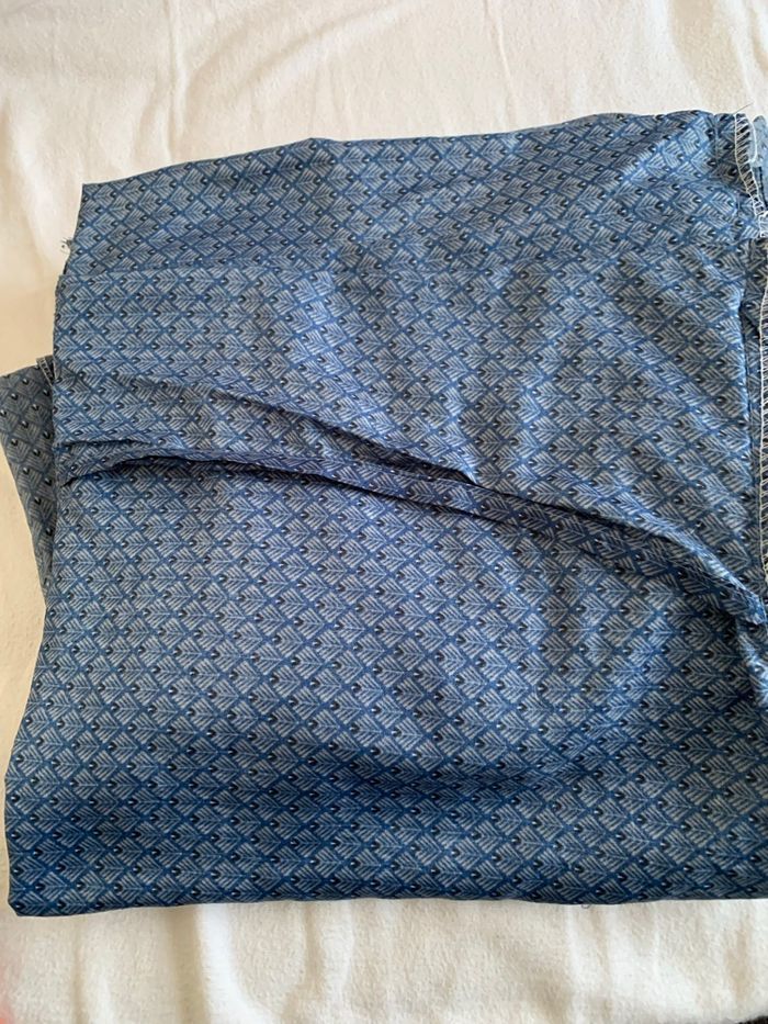 Housse de couette 220x240cm et ses 2 taies d’oreillers , de couleur bleue à motifs, la couette a été réparé par une couturière et il y a une taie qui est un peu boulochée