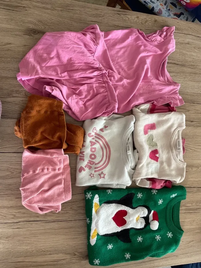 Lot comprenant 2 pulls fins : orchestra. Un pull de Noël (gémo), 2 collants 27/30 (orchestra) et une robe manche courte (primark). Tout en taille 5 ans.