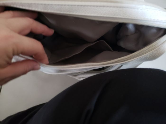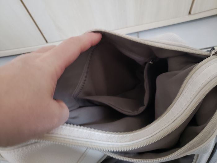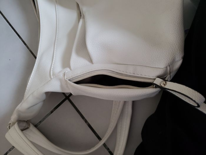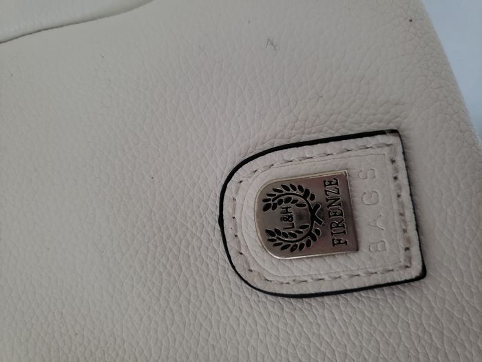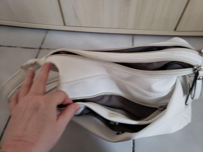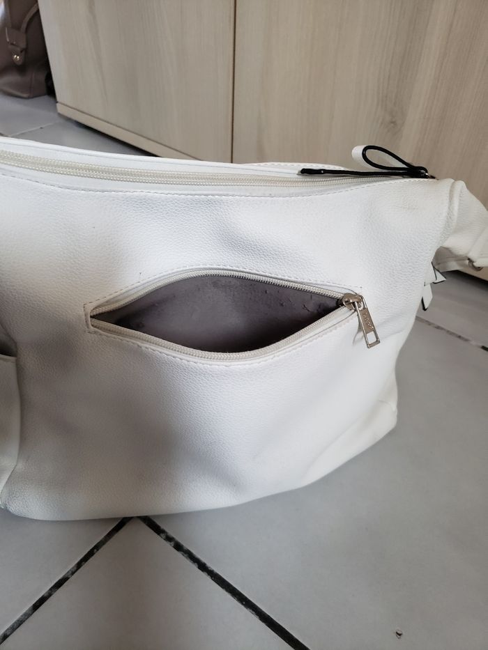 Sac à main bandoulière blanc multipoches intérieur et extérieur en très bon état avec quelques tâches infimes qui devraient partir avec bon détachant.