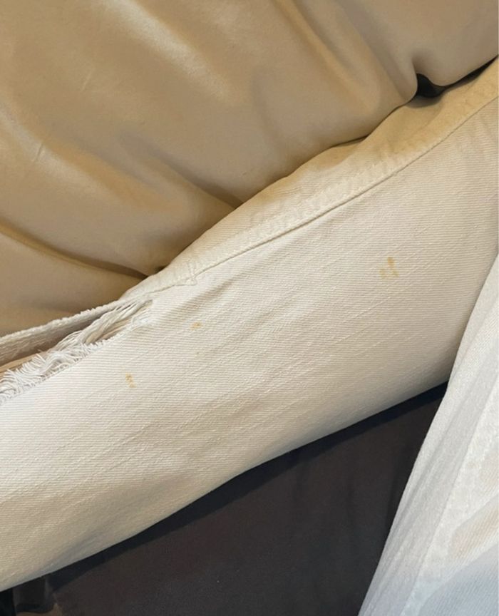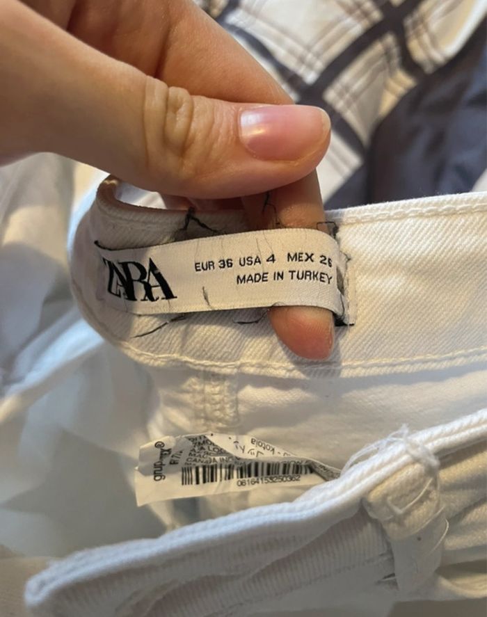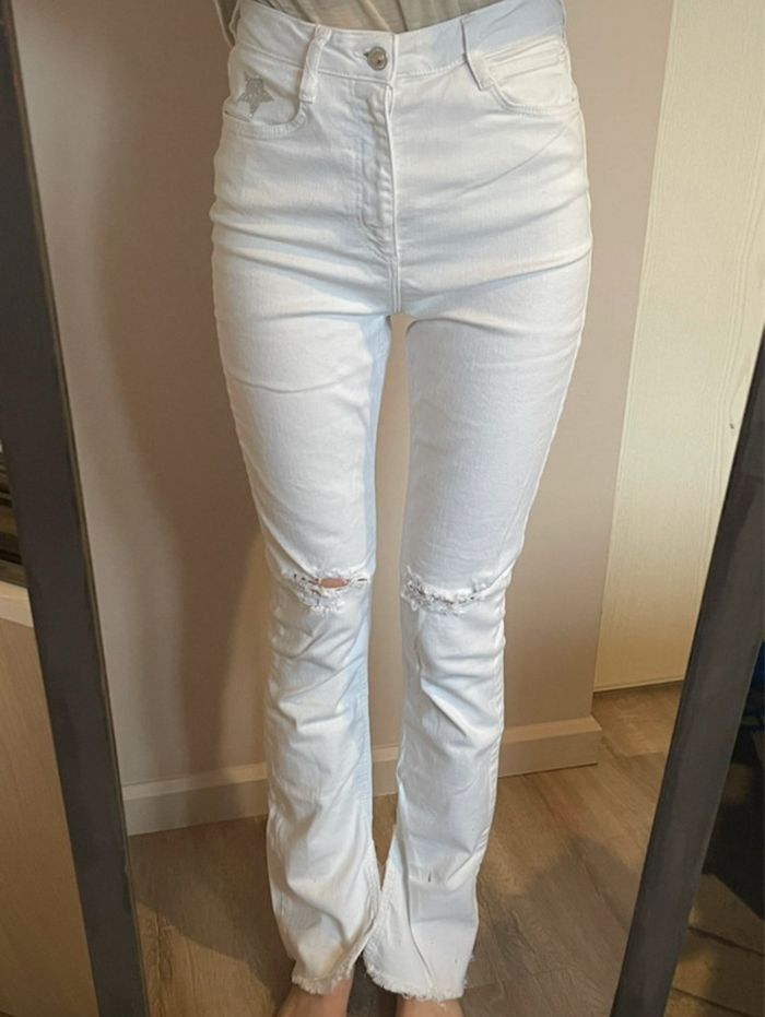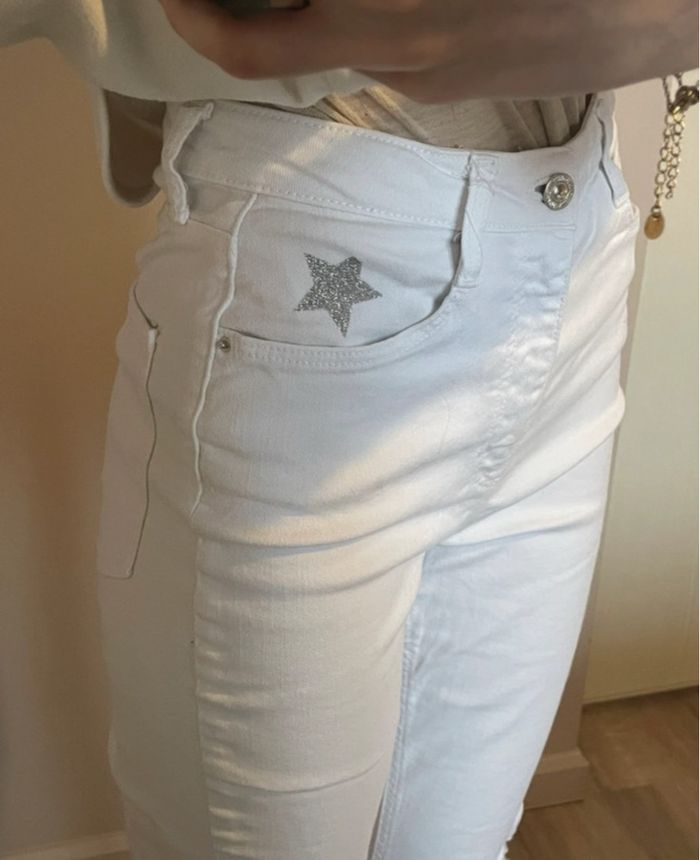 Jean blanc taille 36, marque Zara, taille haute et évasé. Quelques taches discrètes en bas derriere le mollet droite