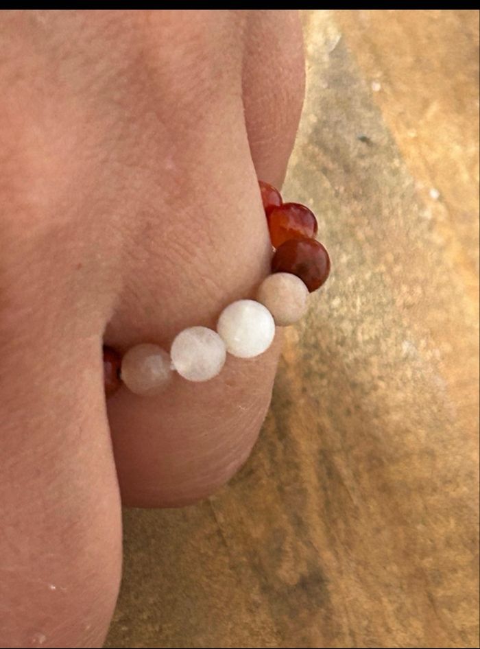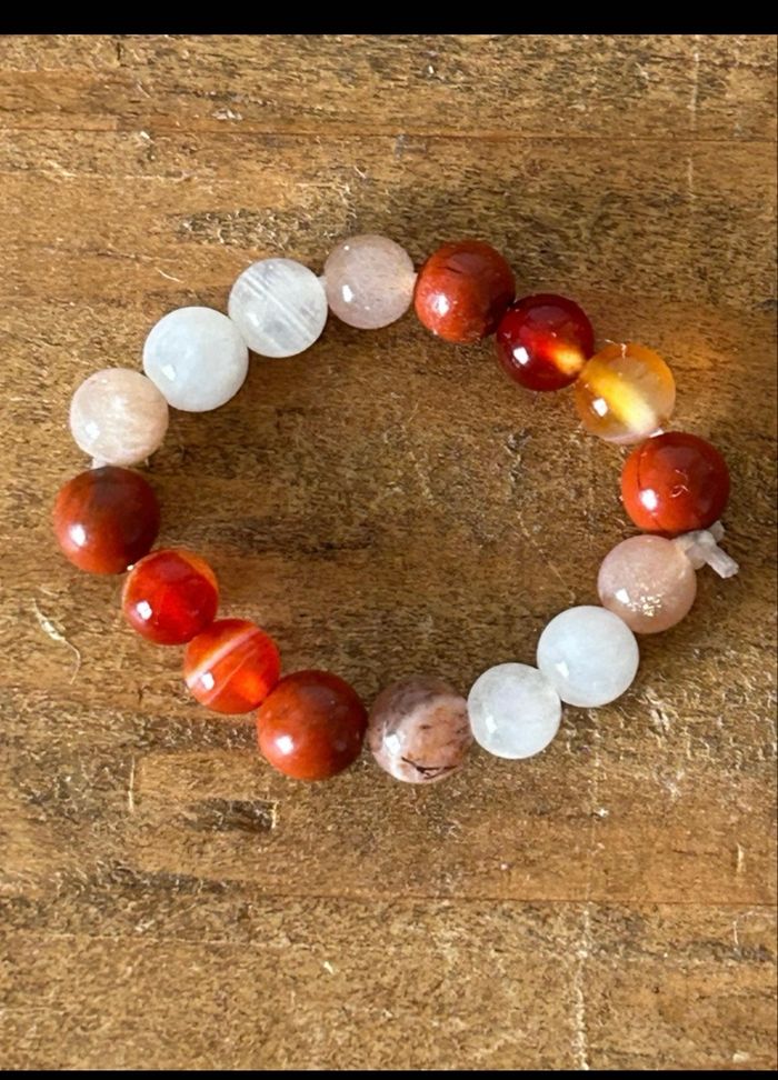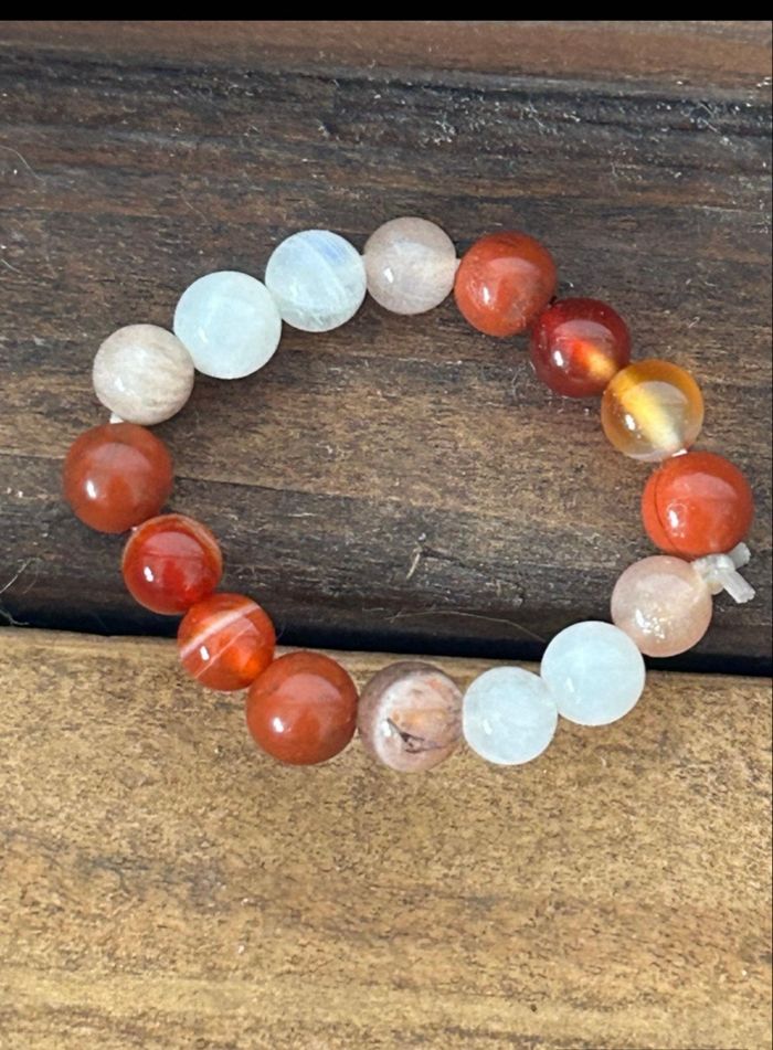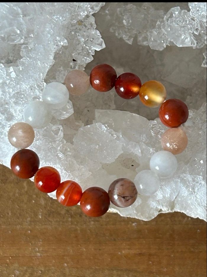 La cornaline soutient la vitalité du bas ventre, la pierre de lune accompagne l’équilibre hormonal et émotionnel, tandis que la pierre de soleil rayonne confiance et joie de vivre.