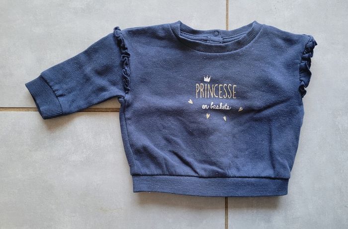 Sweat de couleur marine avec froufrous et inscription dorée, de la marque Tape à l'œil, taille 3 mois (59 cm), en très bon état. Article lavé pour la vente.
