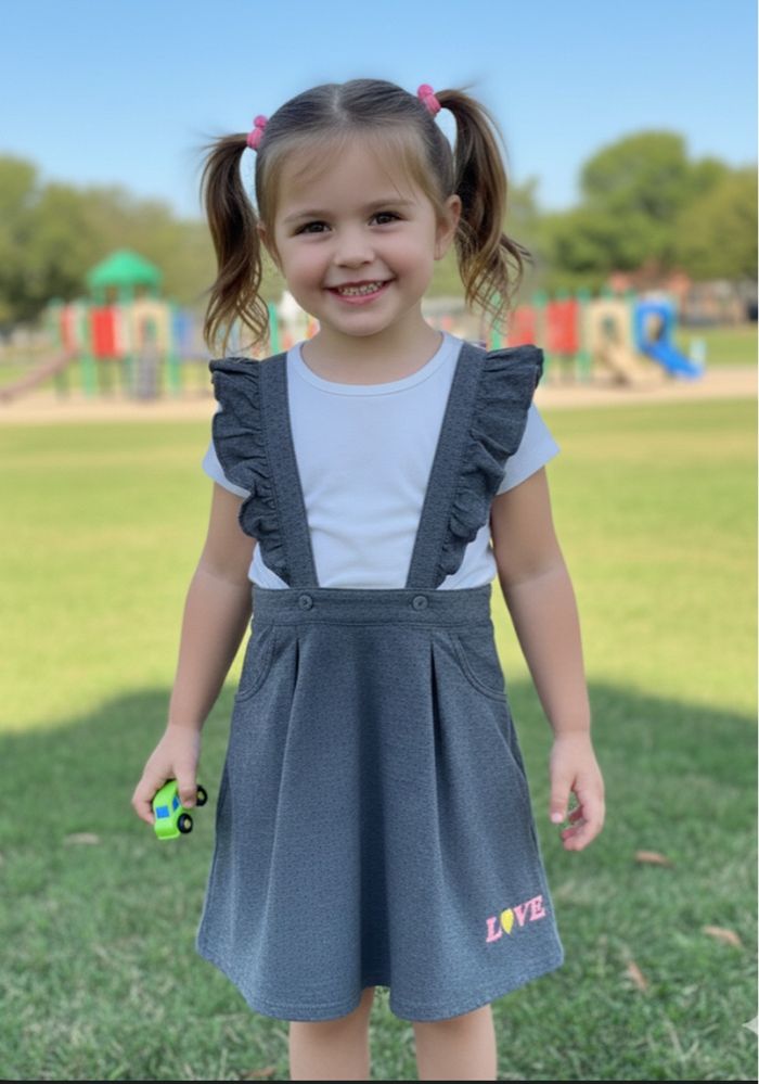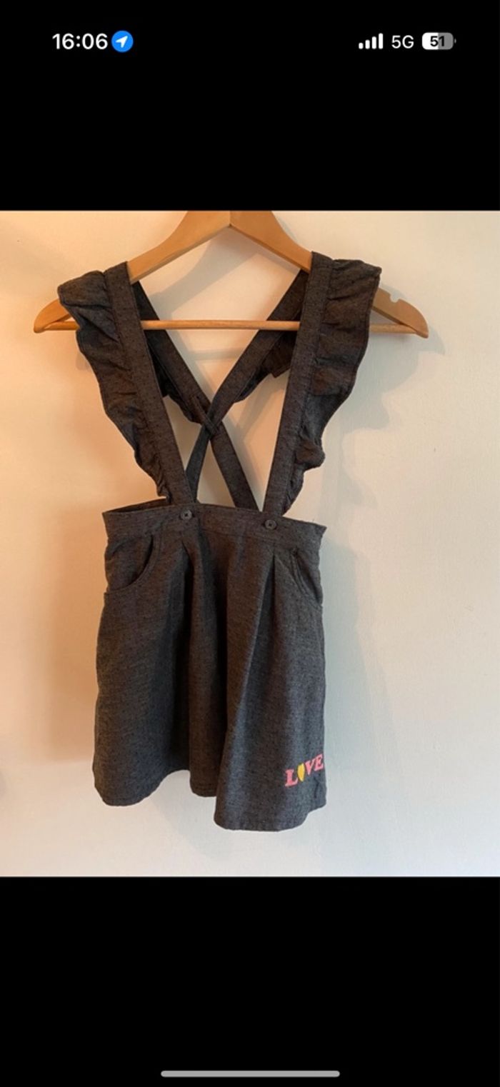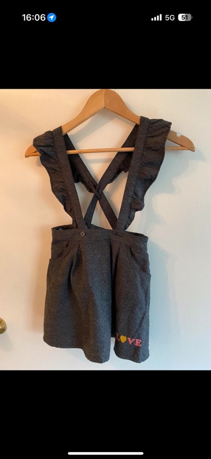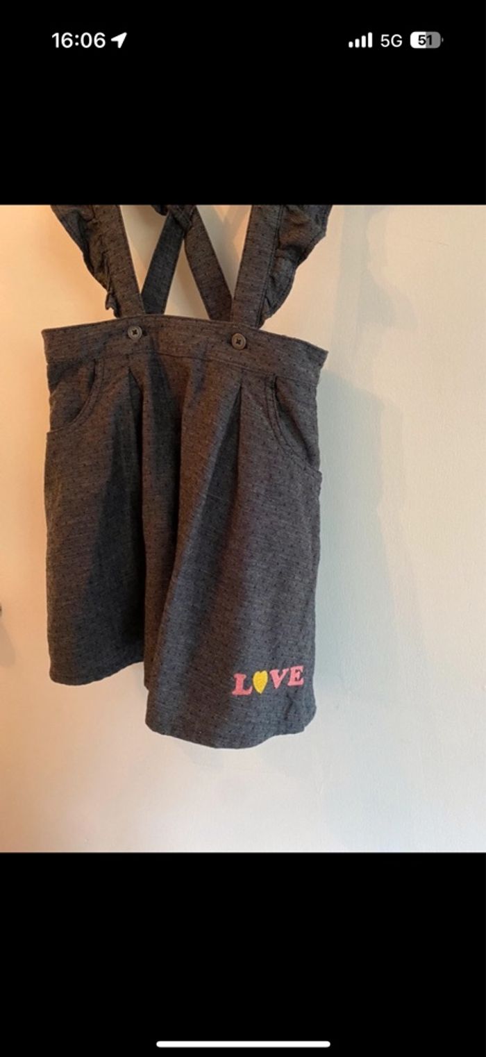 Jolie jupe salopette de la marque Orchestra, parfaite pour une petite fille de 6 ans 👧 🏷️ Marque : Orchestra 📏 Taille : 6 ans 🎨 Couleur : Grise 💬 Motif : Écriture « Love » 🔄 Taille réglable avec élastique 🧼 Très bon état