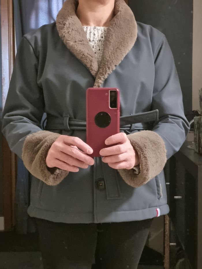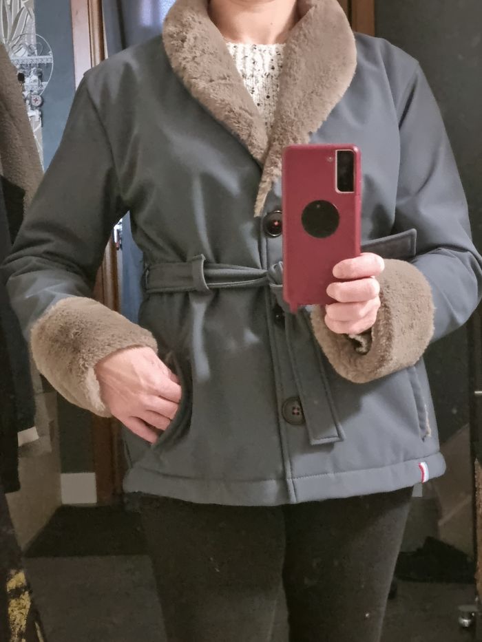 Veste doublée de couleur gris bleu, marque " skidress". Fourrure au niveau du col, bas des manches et 2 Poches fourrées. Fermeture avec boutons et ceinture.