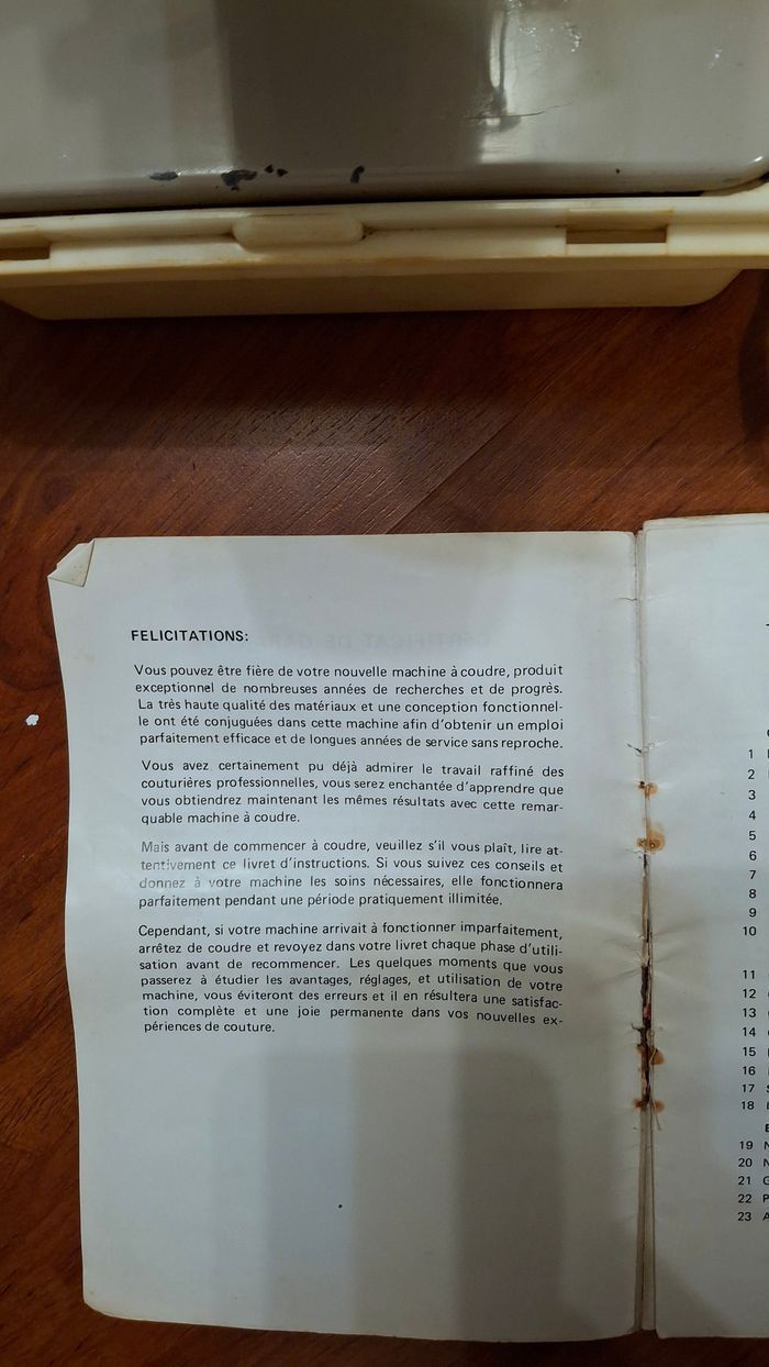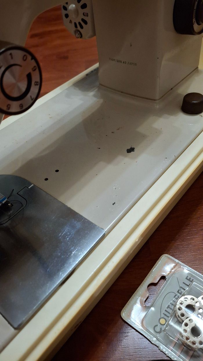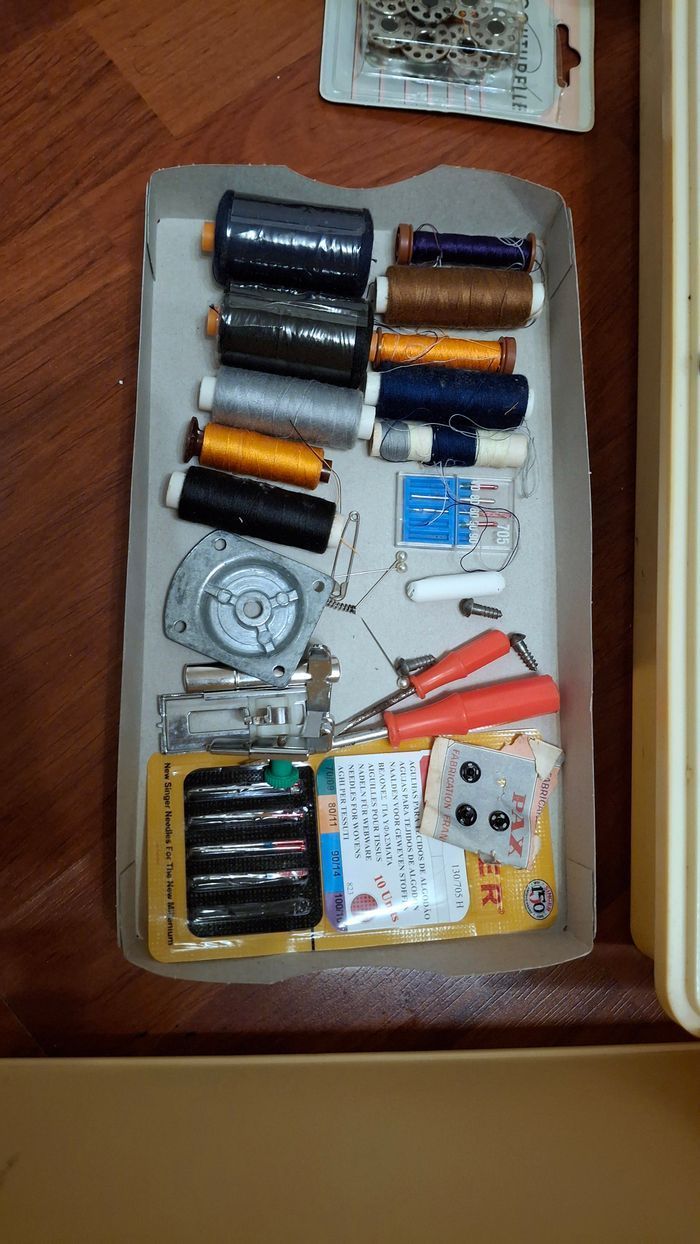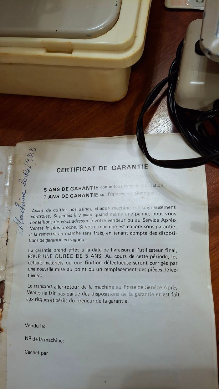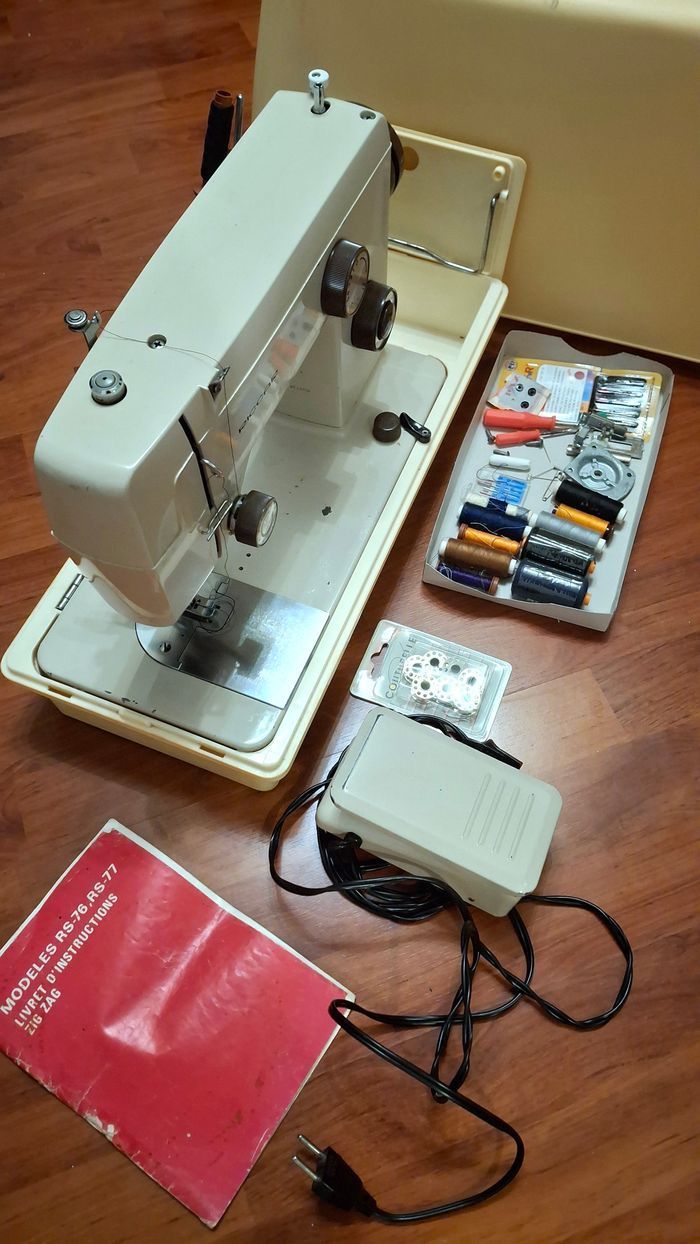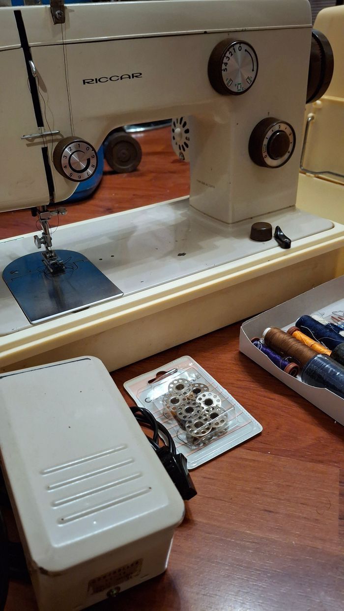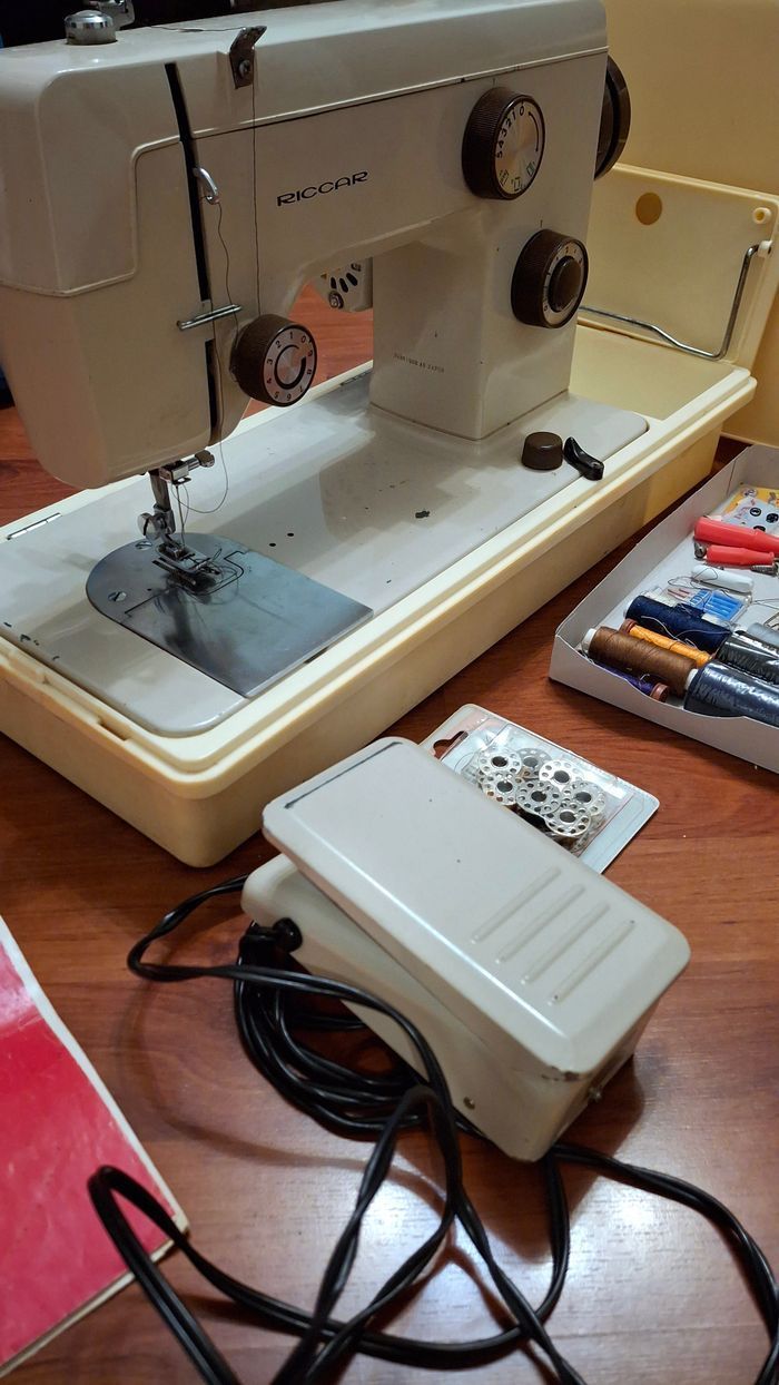 Machine à coudre authentique Riccard de 1983. En très bon état, tout fonctionne. Seules quelques dégradations naturelles dûes à l'utilisation sont visibles sur la zone de travail (voir photos). Inclut la garantie datée, la notice pour laquelle la manière dont elle est rédigée... appartient à son époque. Inclut également tous les accessoires visibles (pédale, bobines, aiguilles, épingles, craies, tournevis).