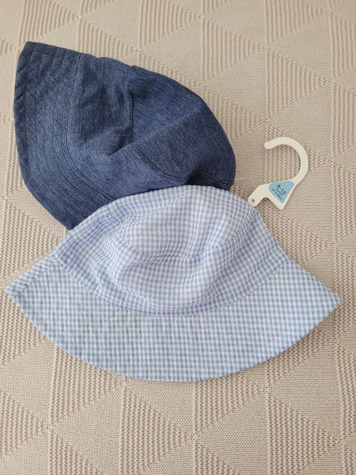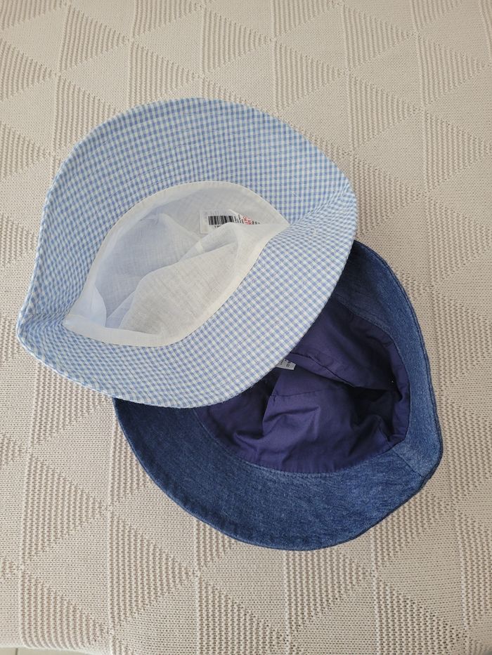 Je vends ce lot de chapeau enfant en coton à carreaux bleus et blancs avec une doublure en denim bleu.