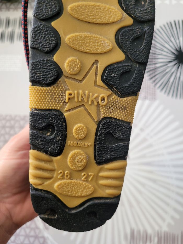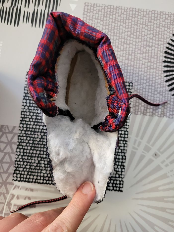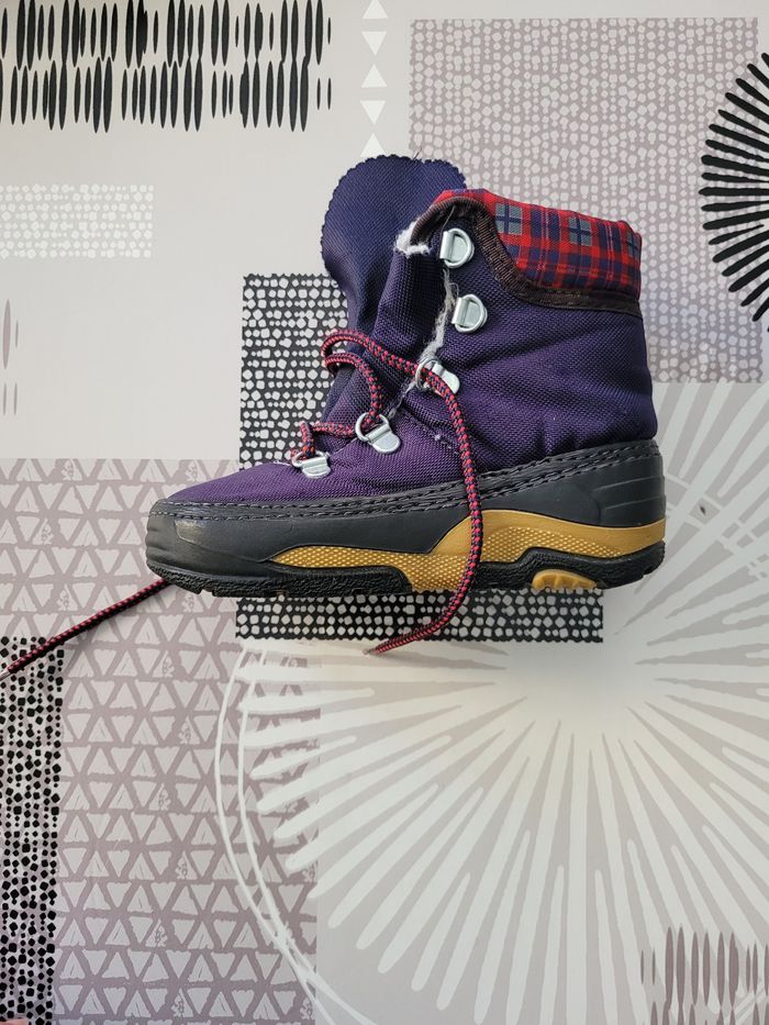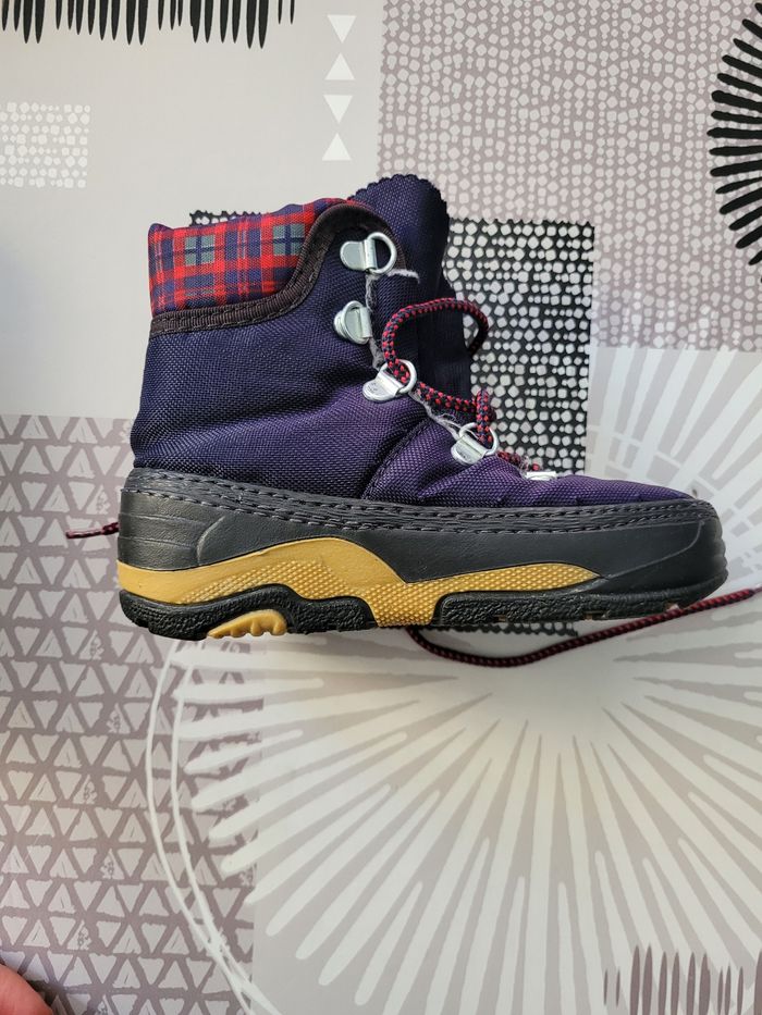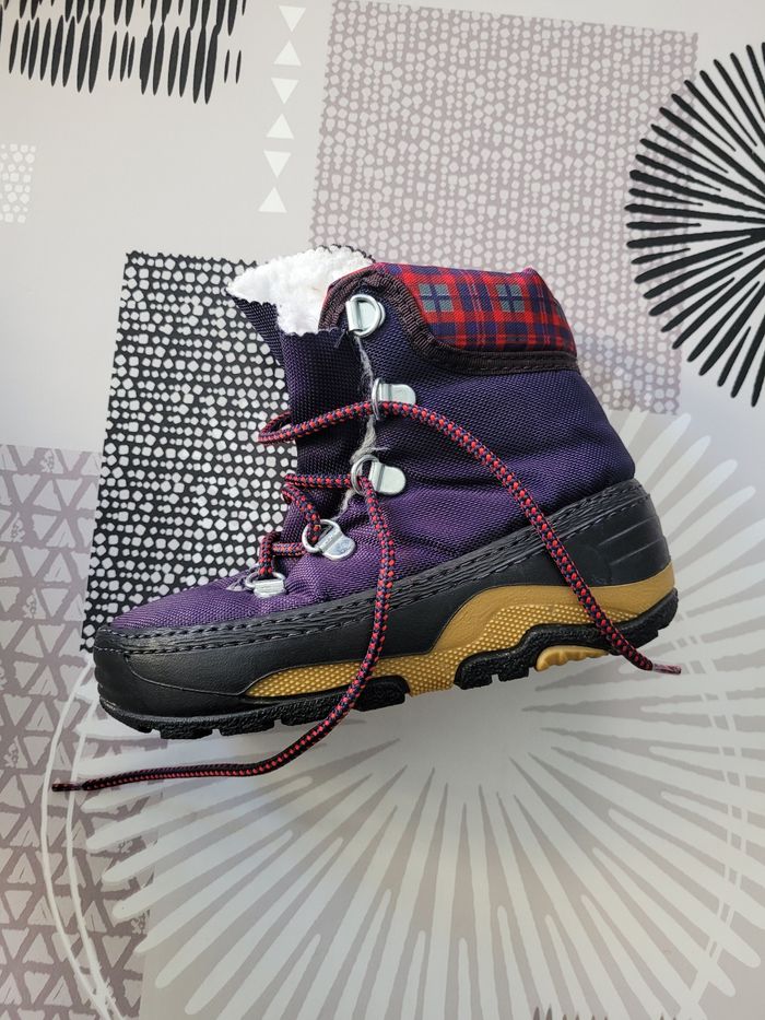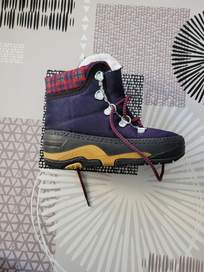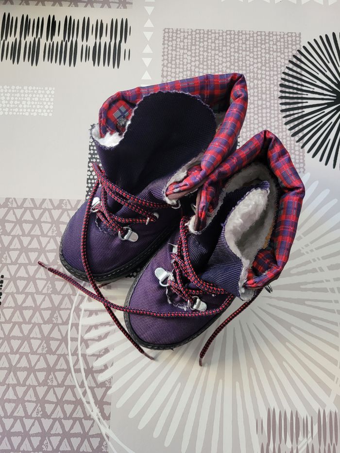 Je vends cette paire de bottines en tissu à carreaux multicolore pour enfant.