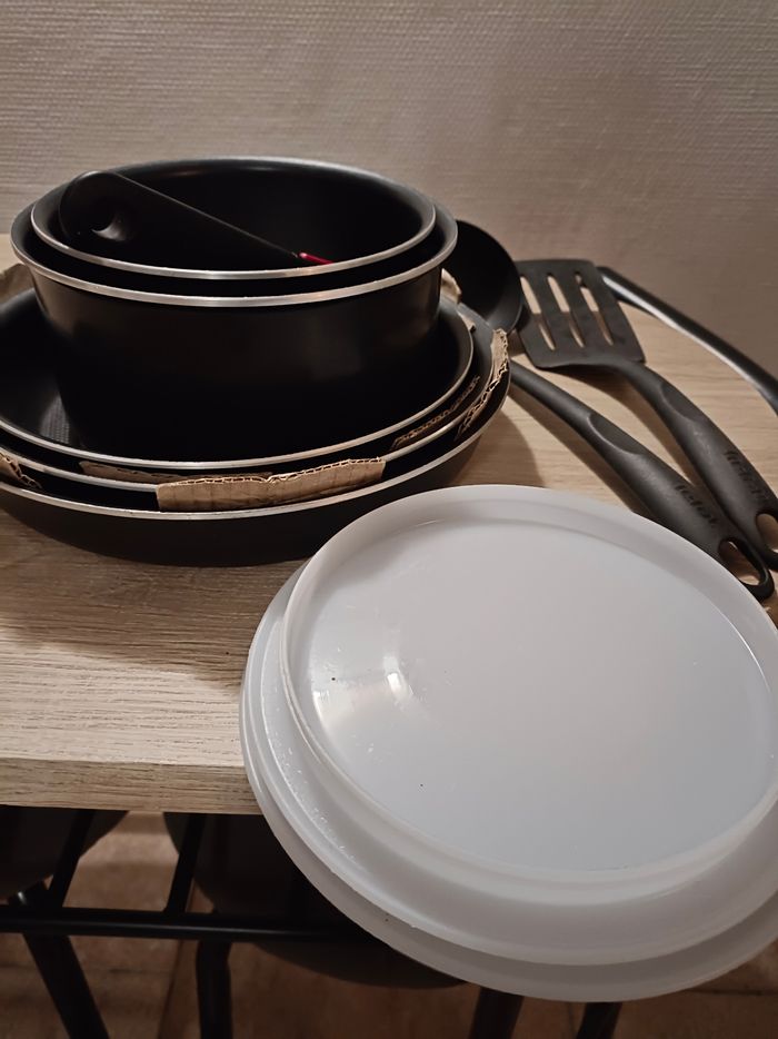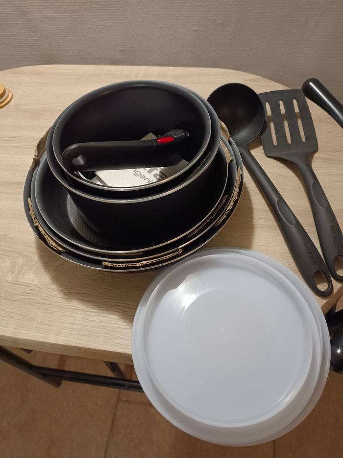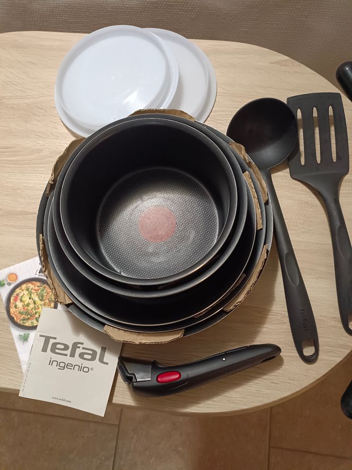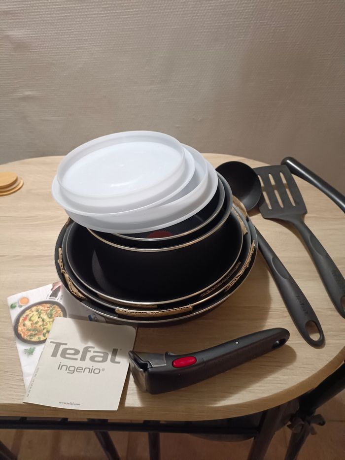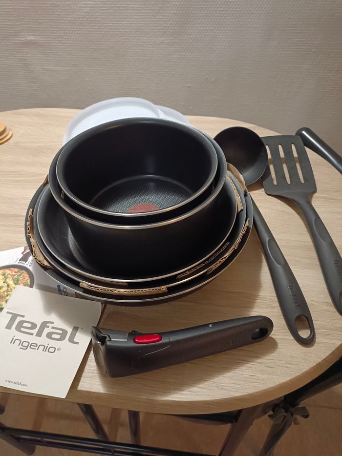 Vends ce lot de 2 poêles, 26 cm, 24 cm, 2 casseroles 19.5 cm, 18 cm ,2 couvercles pour les casseroles une louche et une spatule tout de la marque Tefal ingenio, totalement neuf jamais utilisés , je rajouterai une poêle de 28 cm avec sa poignée déjà utilisé mais qui reste en très bon état en plus