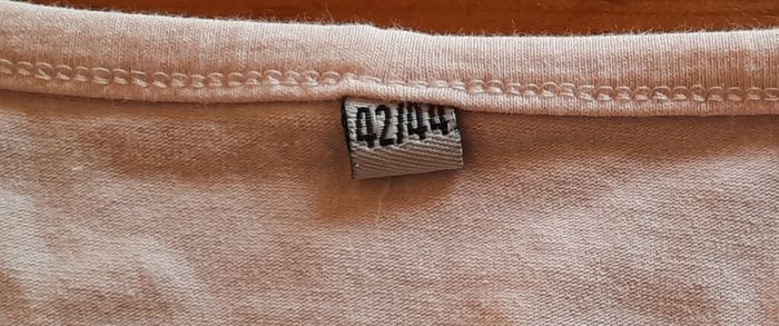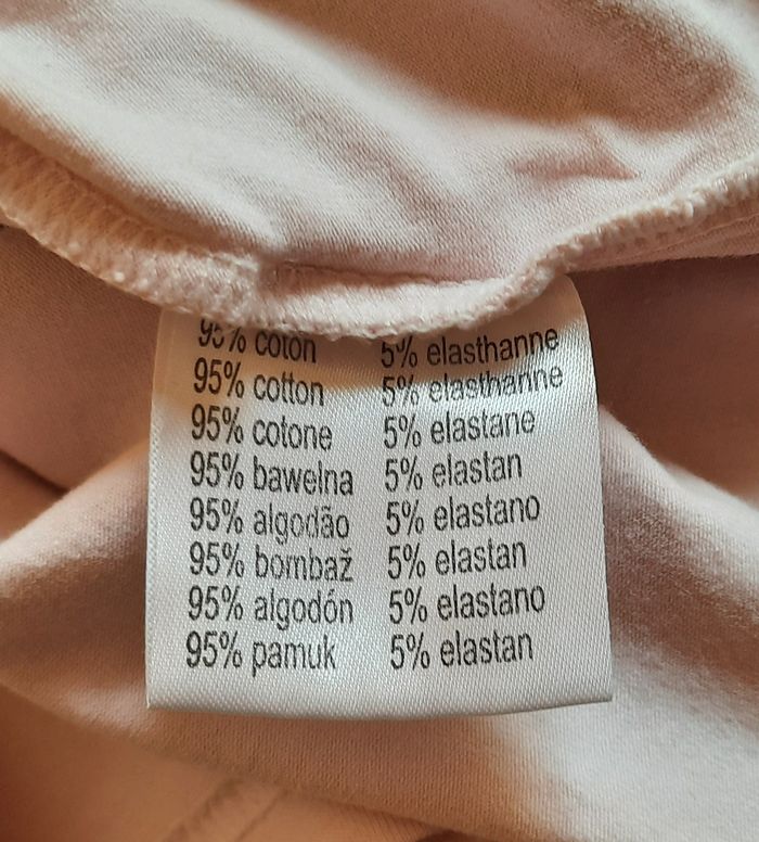 T-shirt rose pâle à manches longues de taille 38. Col en V, manches longues 95 % coton et 5 % élasthanne noté 42/44 mais correspond au vu des dimensions à une taille 38 largeur d'épaule : 38 cm largeur sous les aisselles : 45 cm hauteur : 58 cm