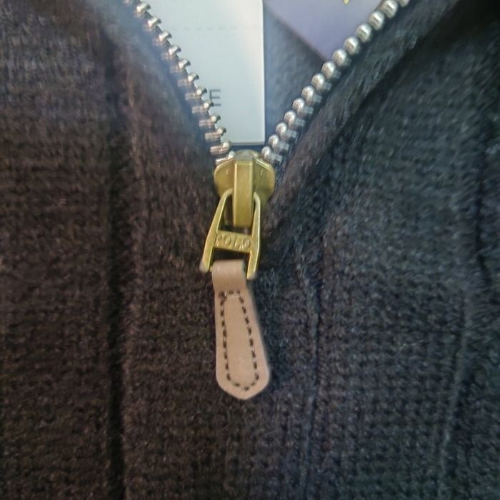 🔹 Modèle torsadé classique avec col montant et fermeture half zip métallique gravée “POLO” et tirette en cuir.