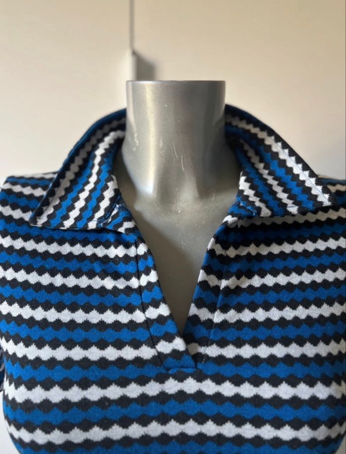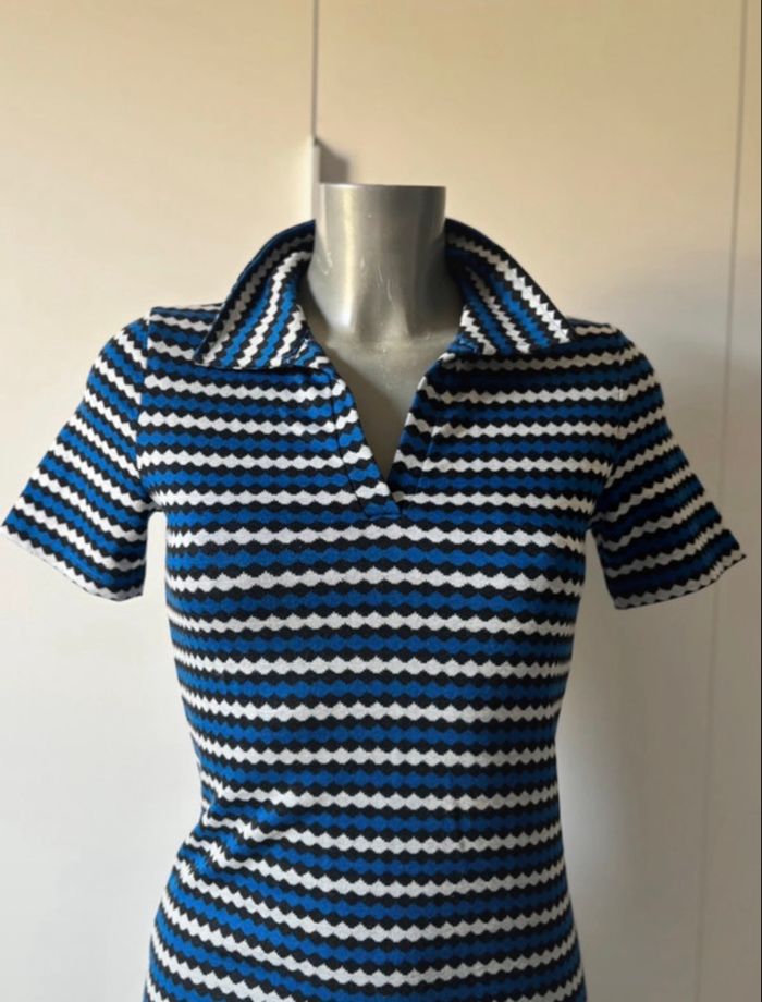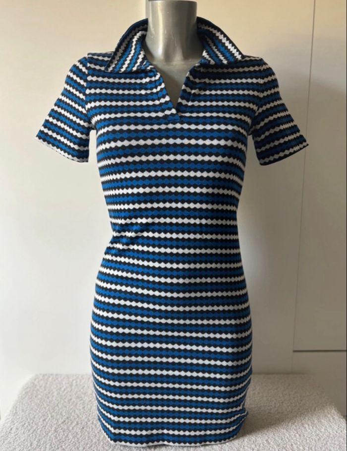 Robe courte à rayures bleu, moulante près du corps avec un joli col en V qui met la silhouette en valeur ✨