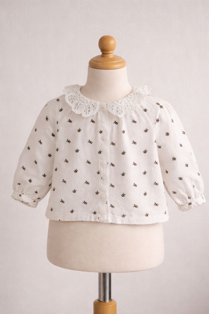 Coloris blanc avec petits motifs fleuris, col Claudine en dentelle et manches longues.
