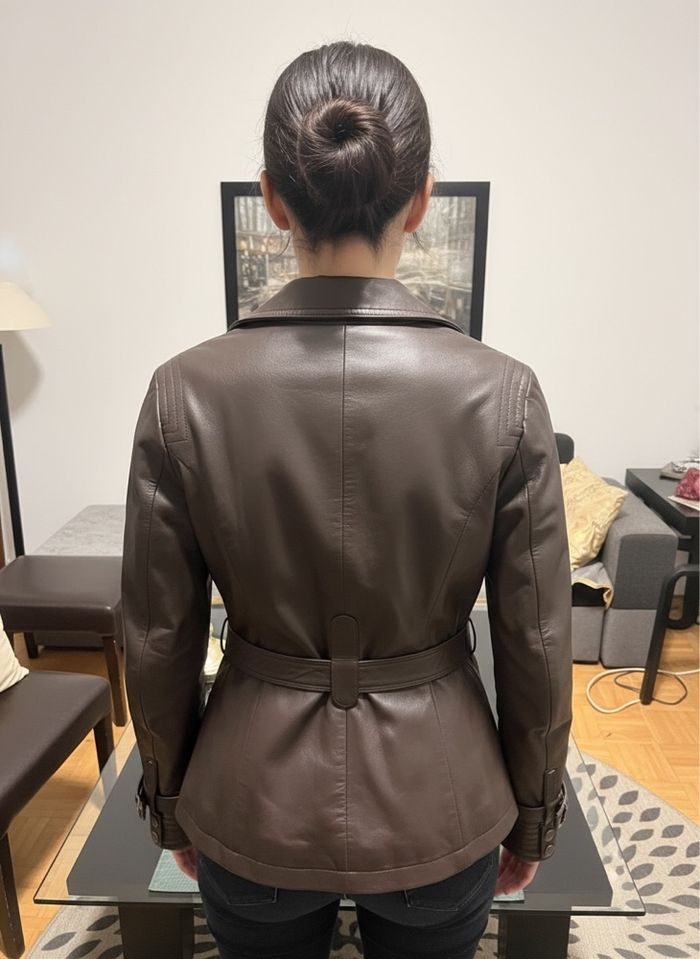 Cette veste en cuir pour femme (ou mixte selon le style) de la marque Forestland est réalisée en cuir véritable de couleur marron foncé. Le design combine élégance classique et touches plus structurées : • Col large à revers, avec un motif surpiqué en chevrons donnant du relief et un aspect sophistiqué. • Fermeture par boutons à l’avant. • Deux poches zippées verticales situées de chaque côté de la poitrine. • Une ceinture en cuir assortie avec boucle décorative et plusieurs boutons-pressions pour ajuster la taille. • Surpiqûres décoratives sur le col, les poignets et la ceinture, apportant un style légèrement motard. • Poignets réglables grâce à une patte munie de boutons-pressions. • Finition générale soignée, coupe structurée, longueur mi-haute. L’ensemble donne une veste au look à la fois chic et robuste, idéale pour un style vintage, urbain ou habillé.