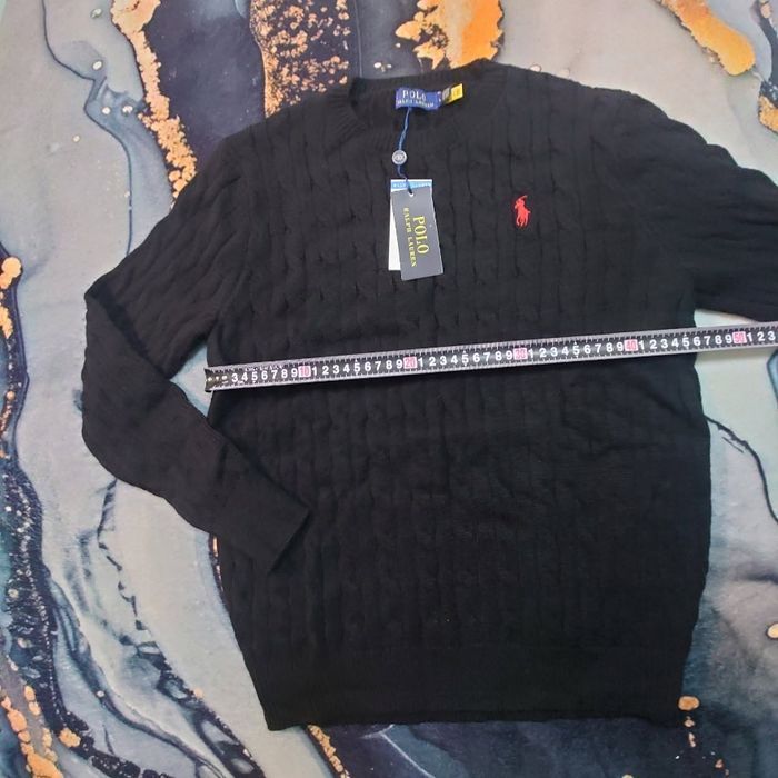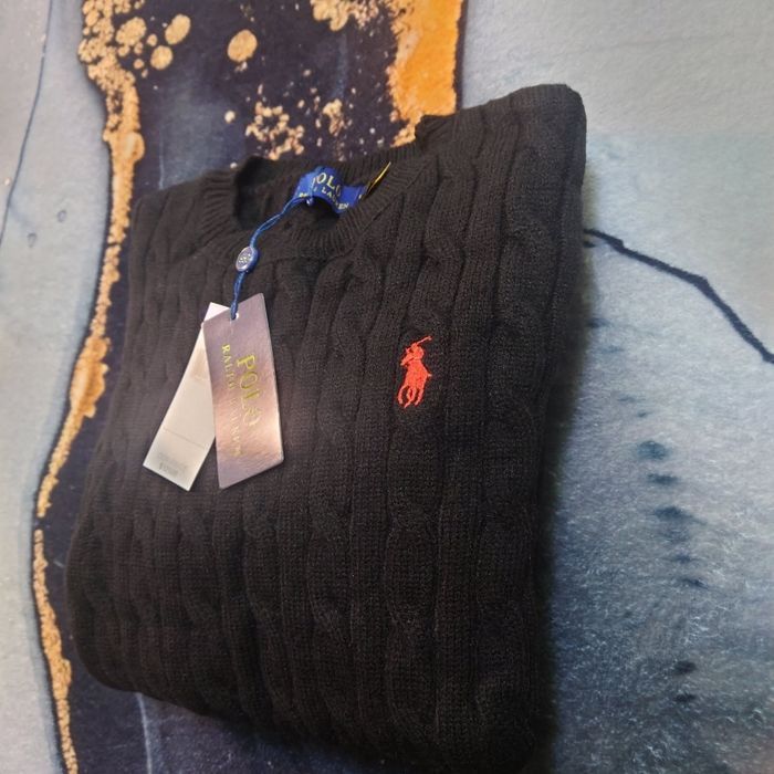 Pull torsadé col rond Polo Ralph Lauren noir logo brodé rouge taille L - photo numéro 1