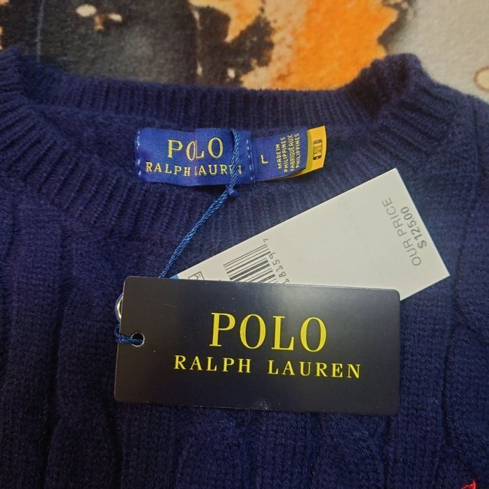 Pull torsadé col rond Polo Ralph Lauren bleu logo brodé rouge taille L - photo numéro 5