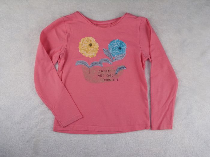 T-shirt à manches longues rose, un imprimé de fleurs devant Taille 5 ans - 110 cm - porté, usure d'usage, ni trous, ni tâches #darkatalia5ans B5
