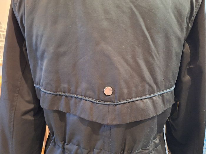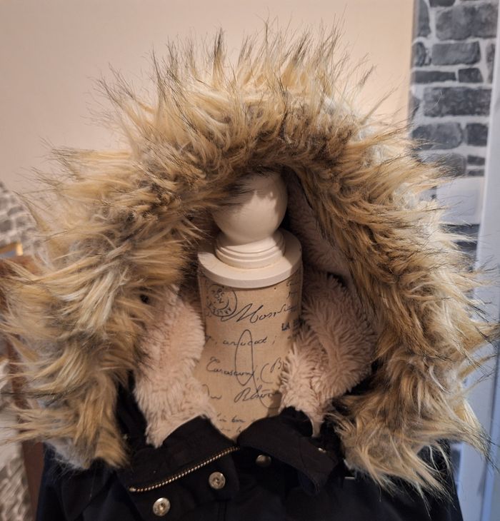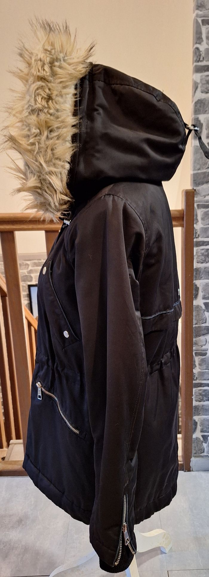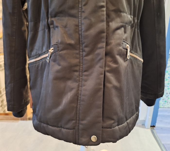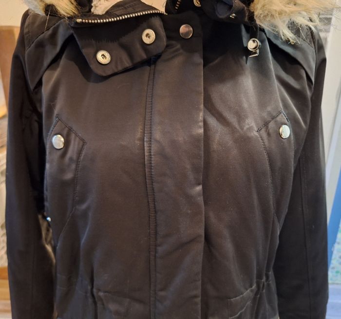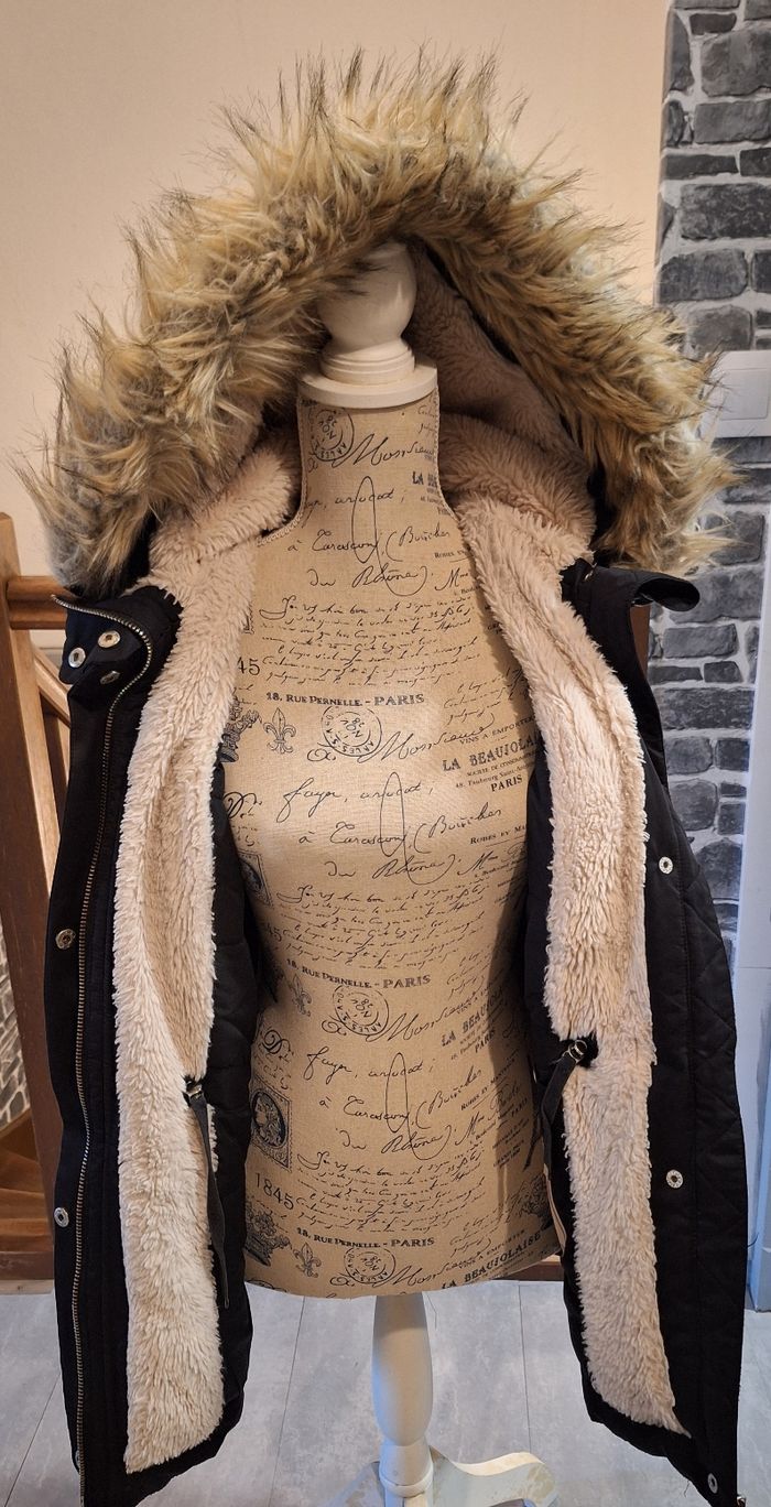 Parka noire avec capuche fourrée avec des poils sur le bord et amovible car elle est zippée. Deux poches à pression et deux poches zippées devant. Une poche pression à l'intérieur. Cordon de serrage à 'intérieur. Zips de décoration aux poignets. Fermée par boutons pression et fermeture éclair, qui malheureusement est hors d'usage. Le manteau peut se fermer grâce aux pressions quand même, ou si vous pouvez le réparer....