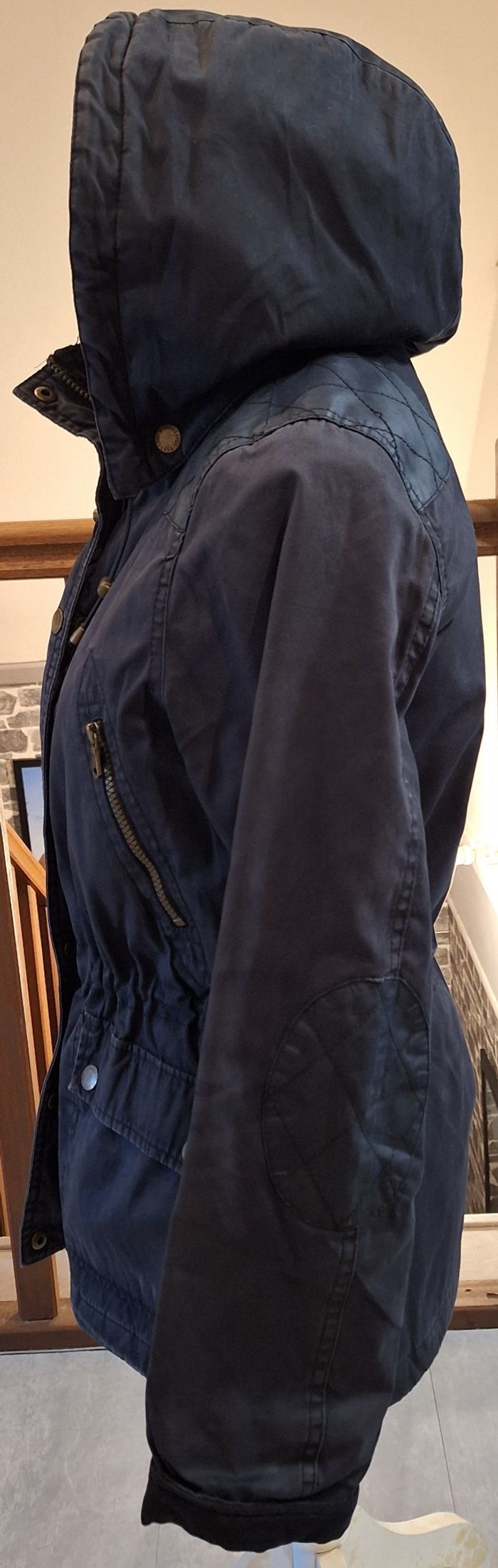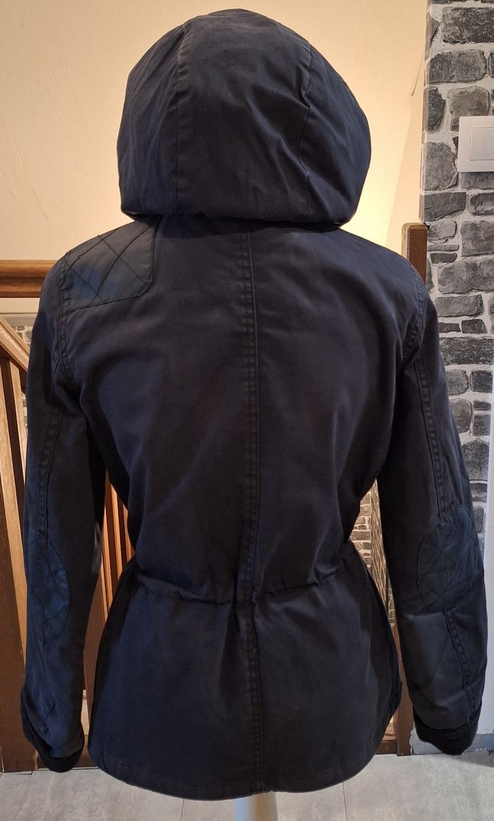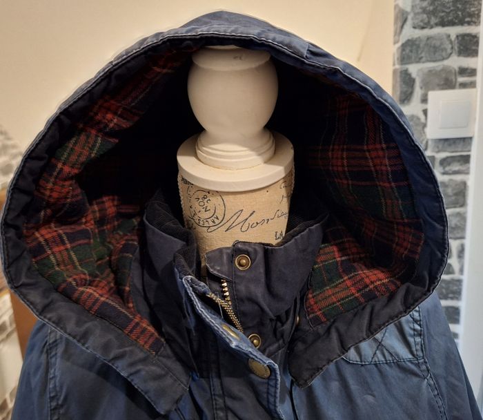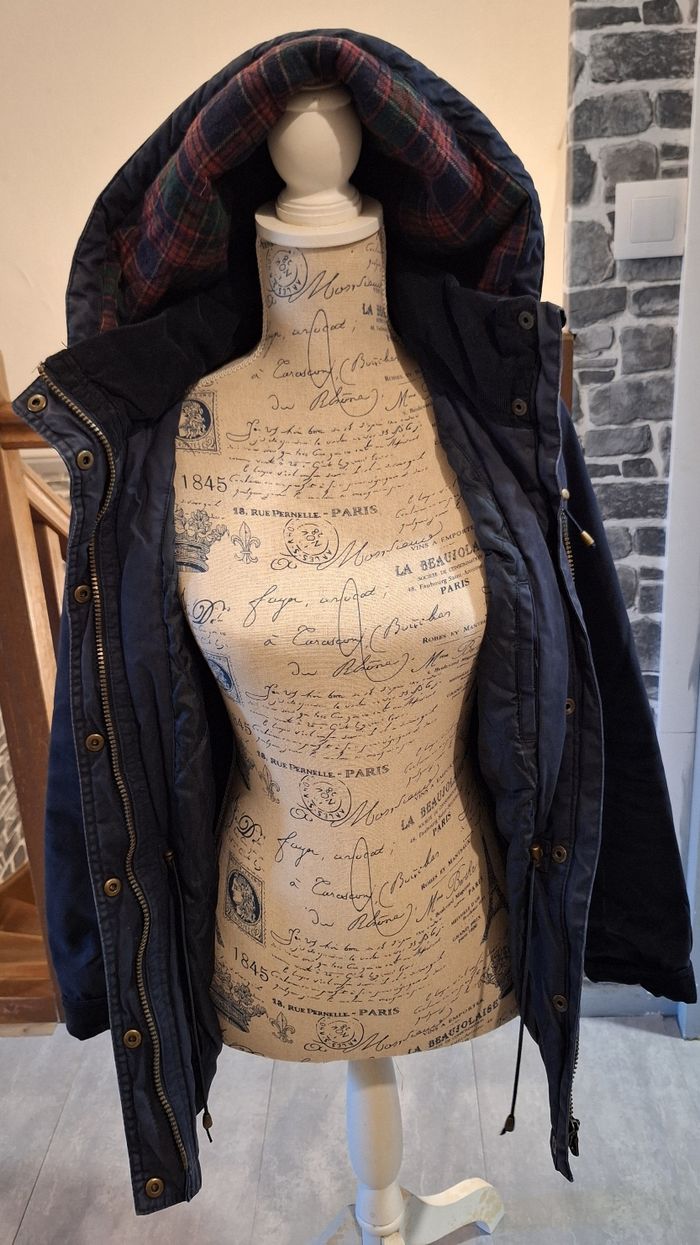 Parka bleu marine avec la capuche à l'intérieur à carreaux qui est amovible grâce à des boutons pression. Parka zippée et boutons pression. Cordons de serrage à l'intérieur. Deux poches zippées et deux poches pression devant. Couleur un peu passée mais peu largement encore servir. En coton et polyester.