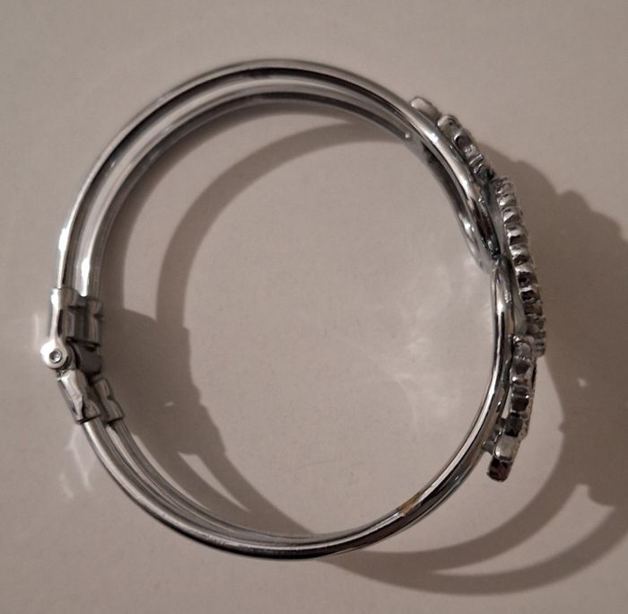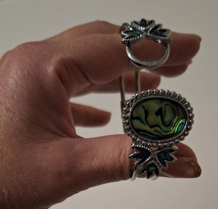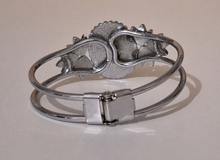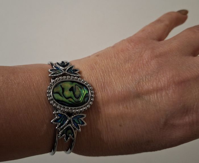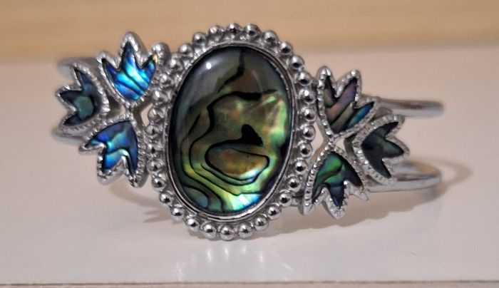 Très joli bracelet articulé en métal argenté et nacre qui fait des reflets verts et bleus. Circonférence 20 cm.