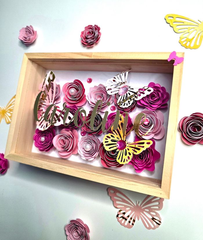 Ce cadre fleuri est composé de fleurs en papier roulées à la main, décorées de strass et perles délicates.