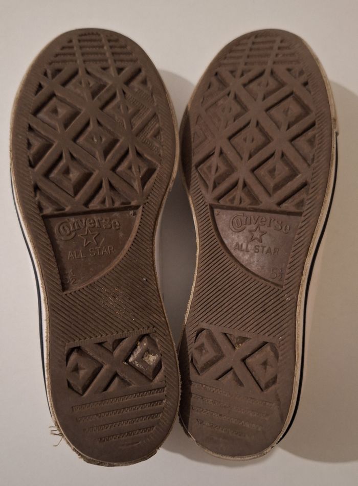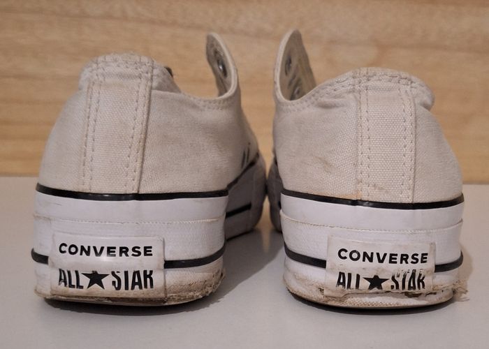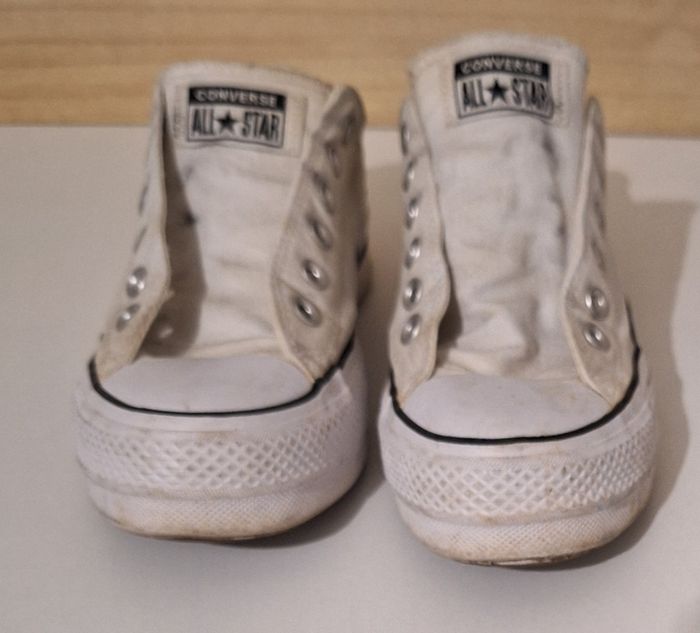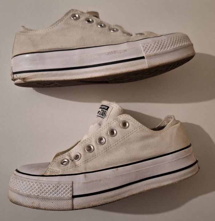 Ont bien vécu mais peuvent toujours dépanner si vous savez comment faire pour bien les nettoyer. Il manque les lacets. Hauteur des semelles : 3 cm.