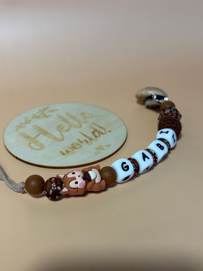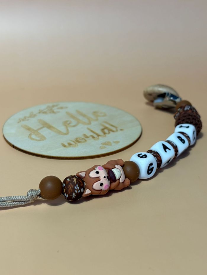 Les attaches-sucettes Mon Petit Pinpin sont conçues avec le plus grand soin, alliant sécurité, praticité et une touche de tendresse. Chaque création est réalisée à la main, à partir de matériaux certifiés, sans substances nocives, pour offrir un accessoire sûr et raffiné au quotidien de bébé. 💖 Caractéristiques : – Personnalisation avec prénom – Perles en silicone alimentaire certifié et/ou bois naturel – Clip de fixation solide et pratique – Fabrication conforme à la norme européenne de sécurité EN 12586:2007 + A1:2011 🧸 Conseils d’utilisation (selon la norme européenne) : – Vérifiez l’attache avant chaque utilisation et jetez-la au premier signe d’usure ou de dommage. – Ne rallongez jamais l’attache et ne la remplacez pas par des rubans, cordons ou élastiques. – Ne fixez jamais l’attache sur des parties détachables des vêtements, rubans ou cordons — risque d’étranglement. – Utilisez l’attache uniquement sous la surveillance d’un adulte et jamais pendant le sommeil (lit, poussette ou berceau). – Ne pas utiliser comme jouet ou anneau de dentition. – Nettoyage : essuyez avec un chiffon humide et du savon doux ; ne pas faire bouillir, ne pas stériliser ni mettre au lave-vaisselle ou micro-ondes. Avec tout le soin et l’amour de Mon Petit Pinpin, chaque attache-sucette devient bien plus qu’un accessoire : une création sûre, personnalisée et pleine de douceur. 💫