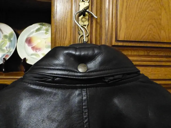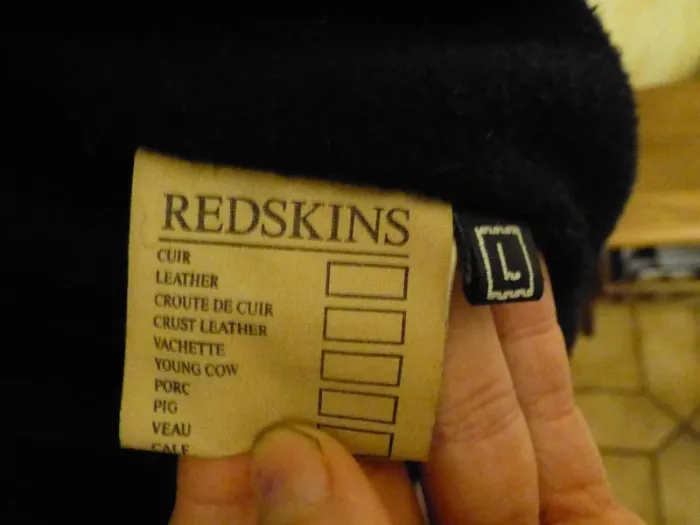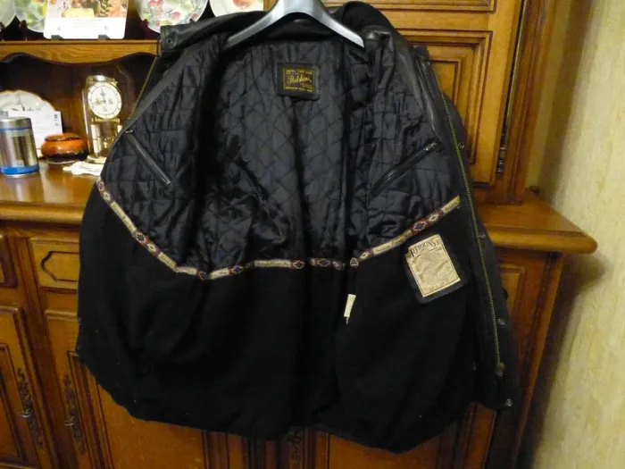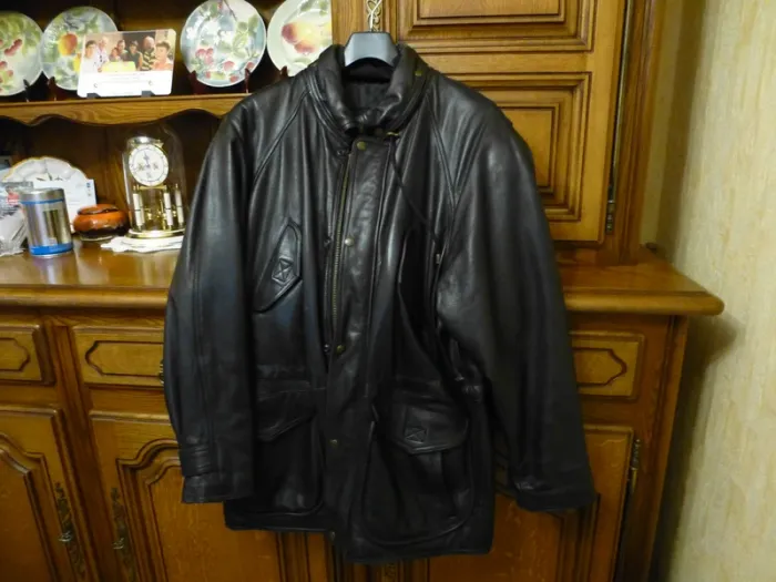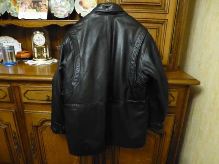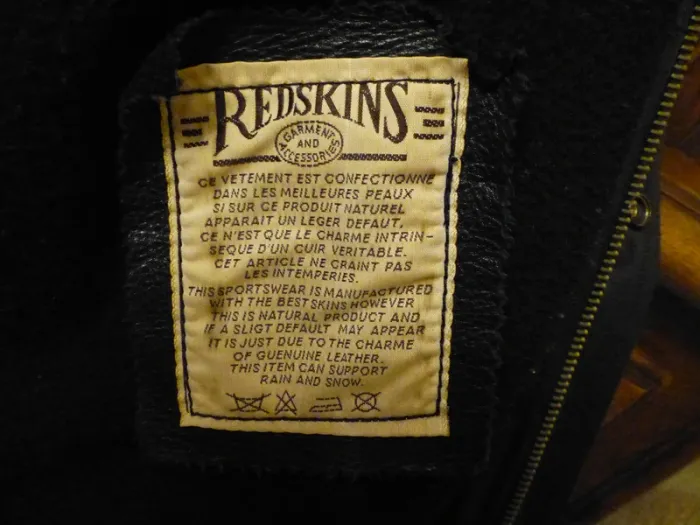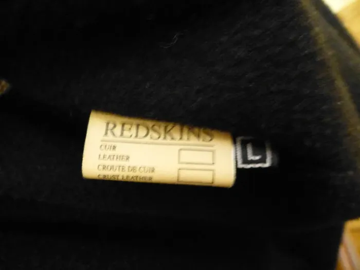 De Longueur 78 cm. En très bon état, très peu porté . Est de taille L. Bien pour la moto. Est de couleur noir foncé. Avec des boutons en métal doré au centre la marque REDSKINS en grosse lettres. En vrai cuir " Top Quarly of leather" et ne craint pas les intempéries. De modèle "Jacket Type B 323 "Army & Civil" de marque Redskins . "Registered trade mark". Avec col rembourré contenant une capuche refermable par un bouton en métal doré et serrable par un cordon noir avec une "poignée" en métal doré". Possède deux poches en haut en biais avec un surpiqûre avec un carré et une croix à l'intérieur en bas très profondes. Au niveau des manches peuvent se se serrer avec une lanière avec un bouton en pression en métal doré. Le Zip en métal doré. L'intérieur est matelassée avec une bande au milieu avec des motifs amérindiens en fond rouge et les dessins contour blanc puis bleu et rouge au centre et un autre type avec des contours vert puis blanc, un losange bleu et un centre rouge, et la 3 ème partie en noir. Un rectangle blanc avec un contour vert "Redskins casual wear". Peut se repasser mais lavage à la main.