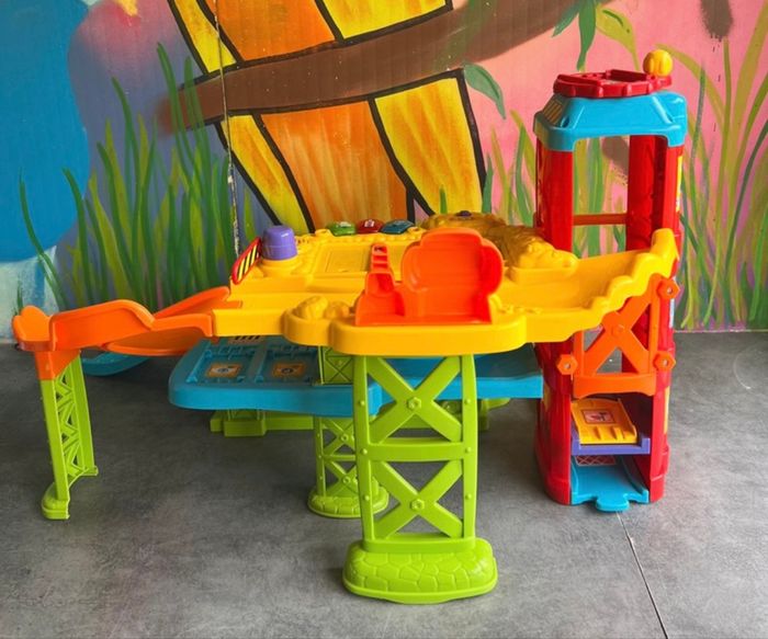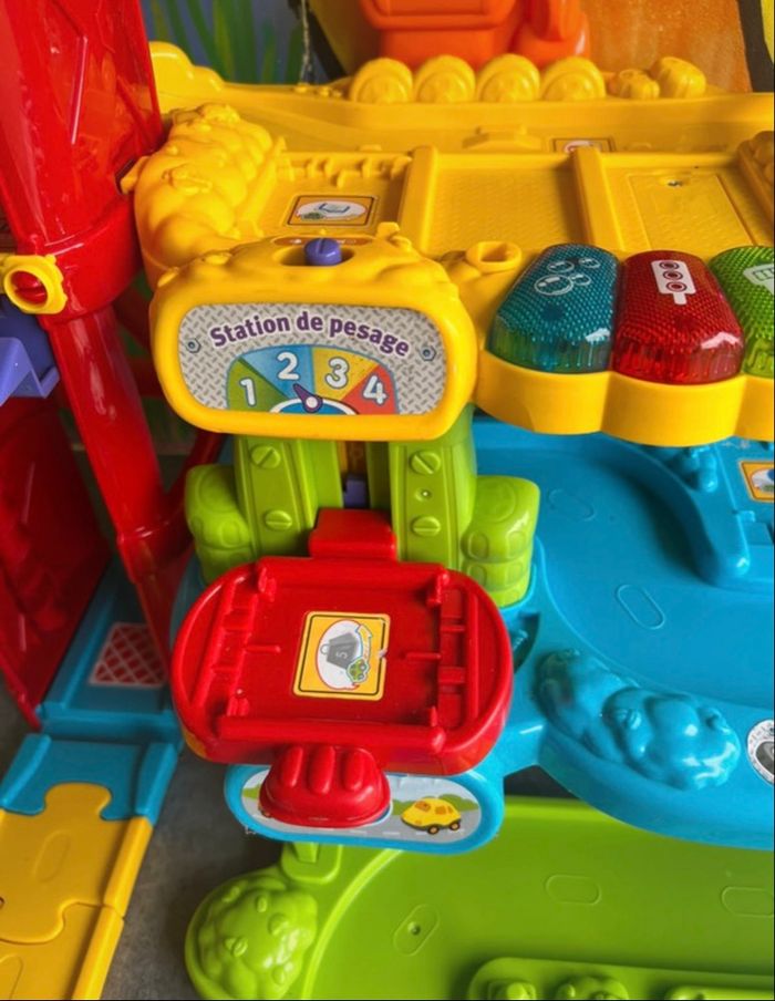 Garage tut tut bolide de Vtech circuit coloré avec plusieurs éléments interactifs. Pusieurs rampes, un ascenseur, un toboggan, une zone de stationnement Le garage est composé de zones magiques pour activer des sons ou des phrases lorsque des véhicules ou des figurines passent dessus. Il y a aussi une "station de pesage" avec des boutons numérotés.