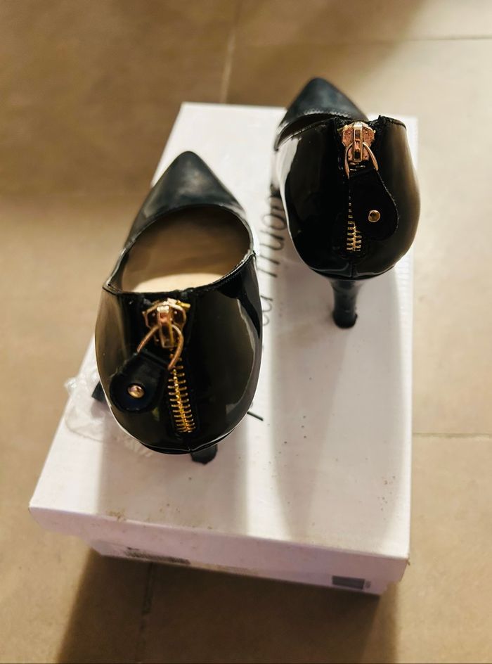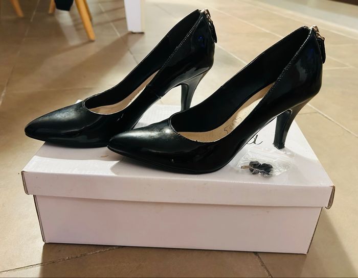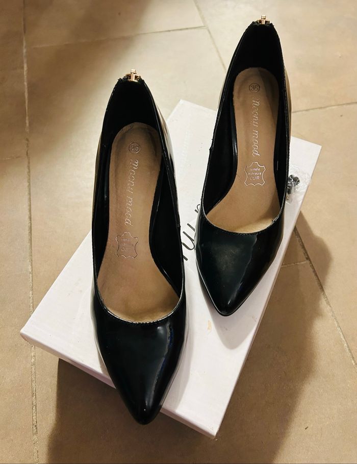 Vends une très jolie paire d’escarpins talons aiguilles vernis noir, Moony Mood, pointure 36, semelle intérieure en cuir, elles sont comme neuves. Elles sont vendues dans leur boîte d’origine avec des talonnettes de rechange.