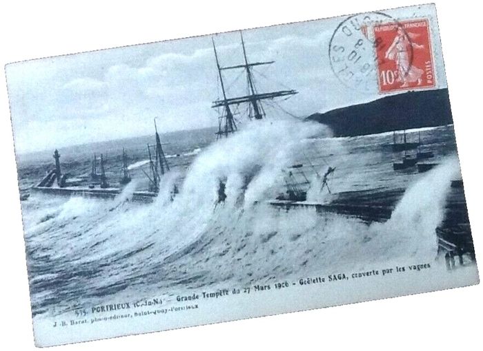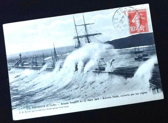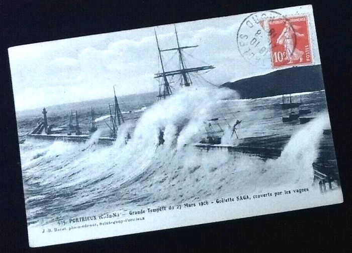 Carte postale ancienne Portrieux (Côtes d' Armor) Goëlette Saga couverte par les vagues Grande Tempête du 27 Mars 1906