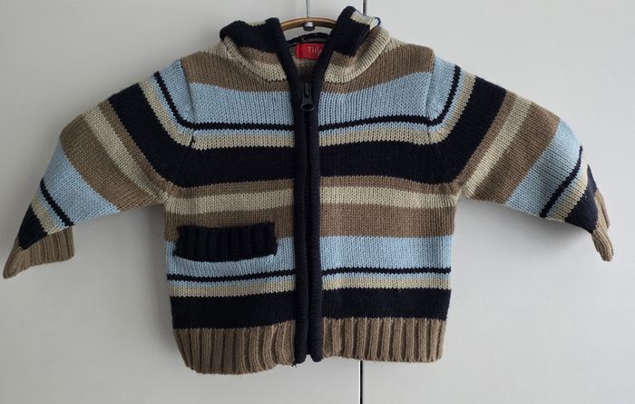 Gilet de marque Tissaia, avec capuche, taille 3 mois, 100% acrylique. rayé dans les tons beige / noir / bleu, 1 poche, fermeture éclair.
