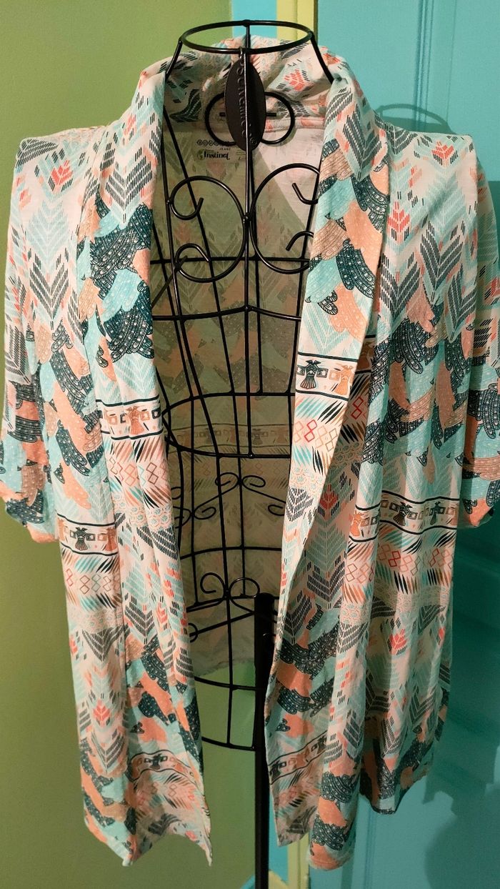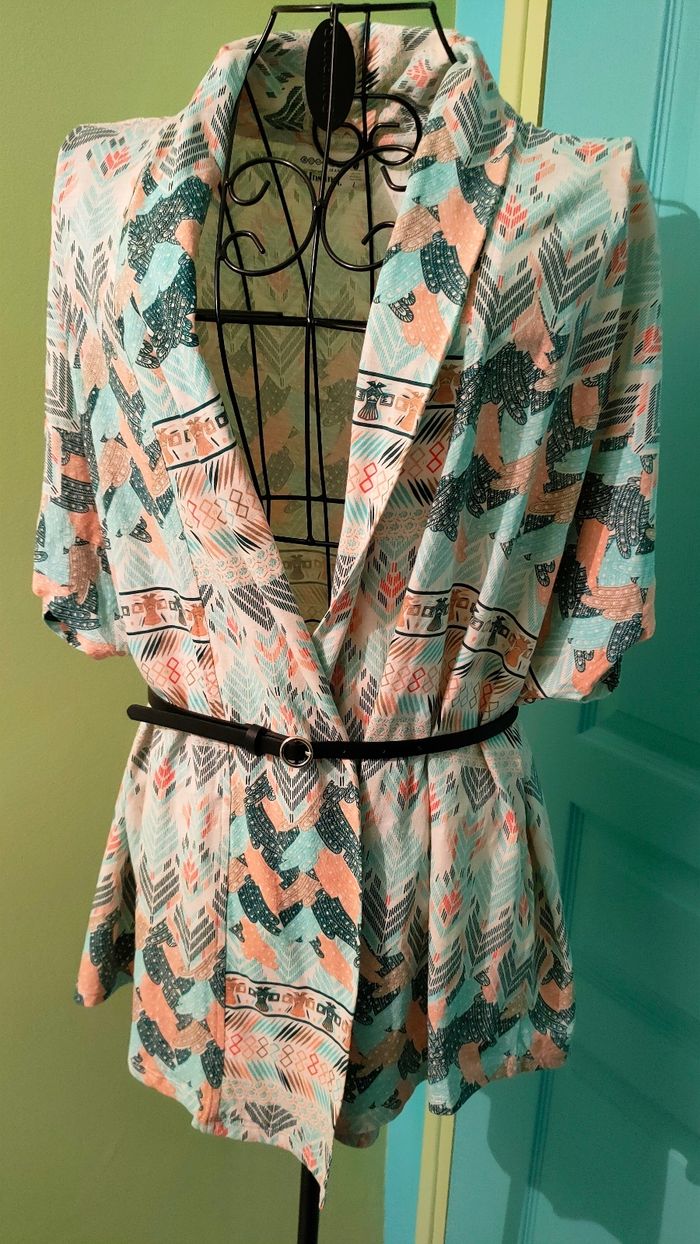Kimono acheté pour un cadeau mais jamais porté. Il est donc neuf. Il est à manches courtes, à motifs symétriques. Se porte relâché, avec ceinture ou noué. Peut convenir également à une personne faisant du 38