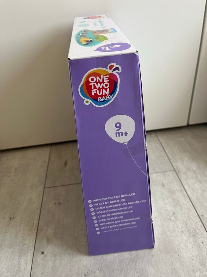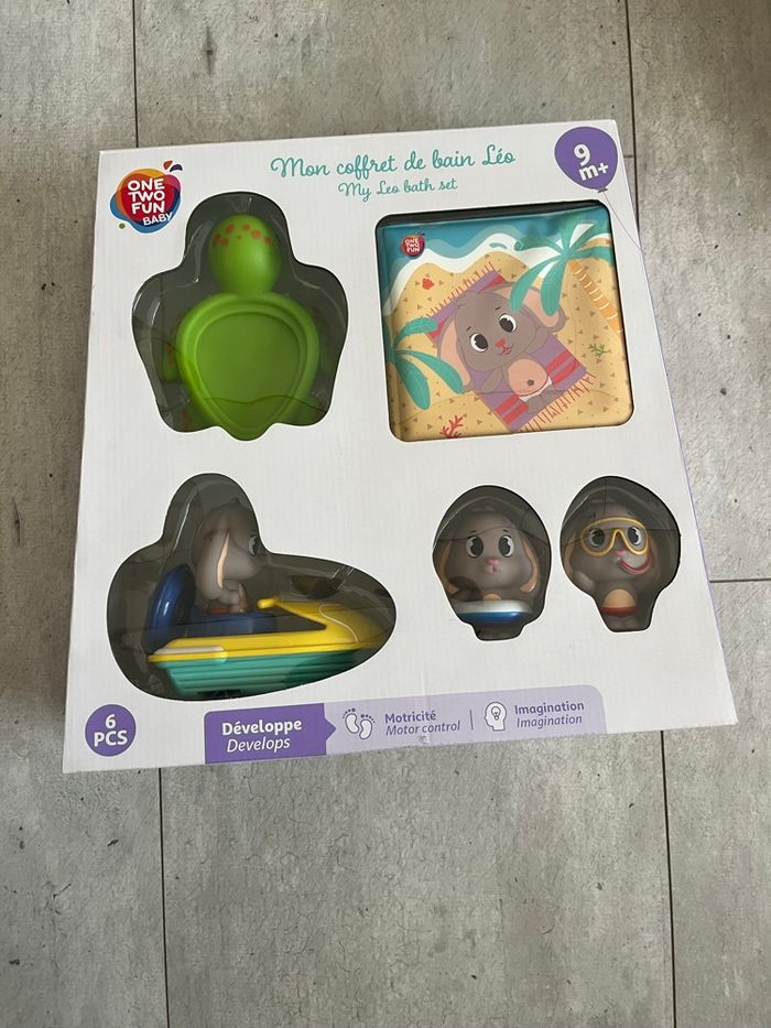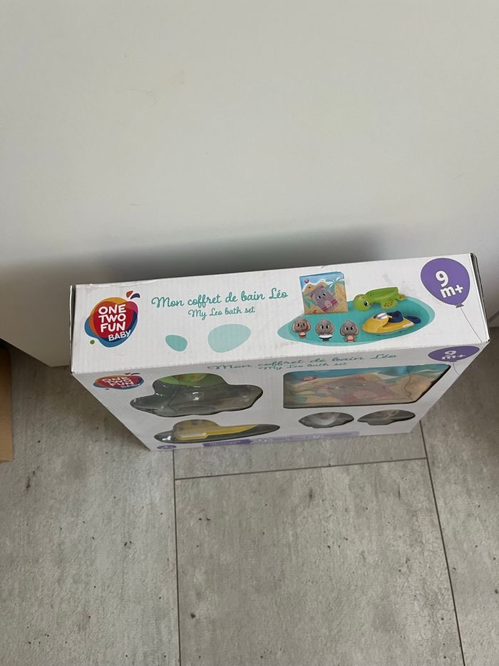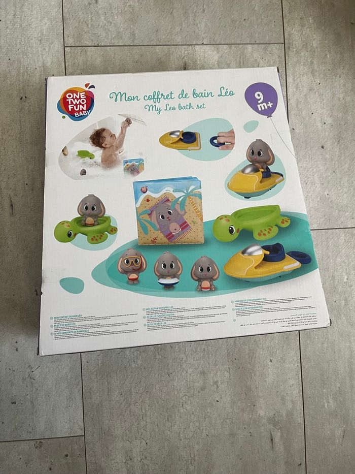 Je vends ce coffret de bain Léo, un ensemble de jouets d'éveil amusants pour les tout-petits.