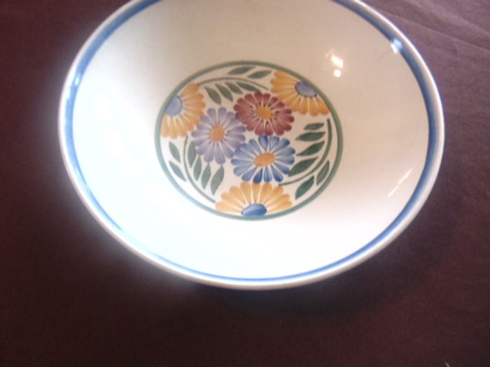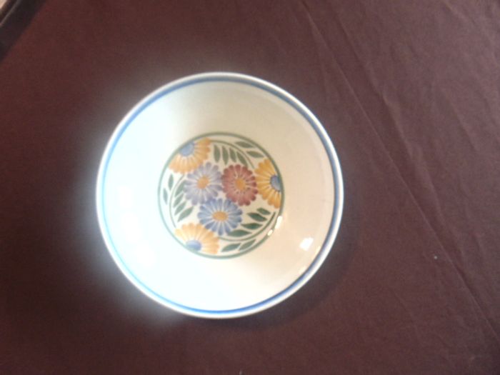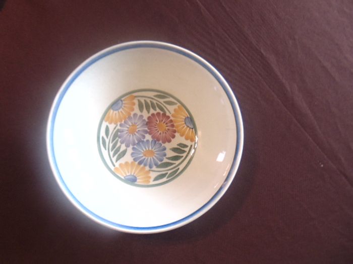 Description : Élégante assiette creuse en faïence, édition exclusive Goulet – modèle Josetti N F.D, au décor floral central vif et raffiné. Bord bleu sur fond blanc, typique du style rétro des arts de la table français. Une pièce rare, idéale pour collectionneur ou décoration vintage.