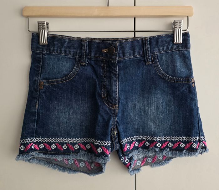 Short en jean de marque In Extenso, taille 10 ans, 100% coton. Couleur bleu, 2 poches avant, 2 poches arrière, passant pour ceinture, broderie. Taille ajustable.