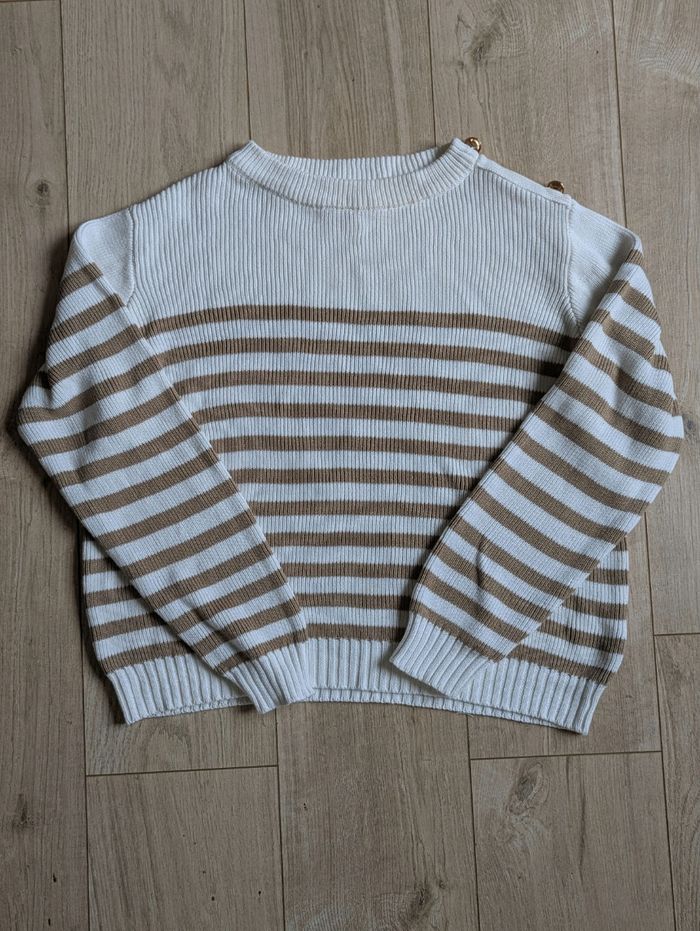 Pull en maille côtelée blanc et marron de la marque Guess, chic et intemporel.