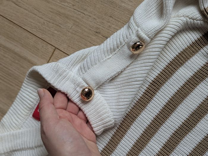Rayures élégantes et boutons dorés sur l’épaule pour une touche raffinée.