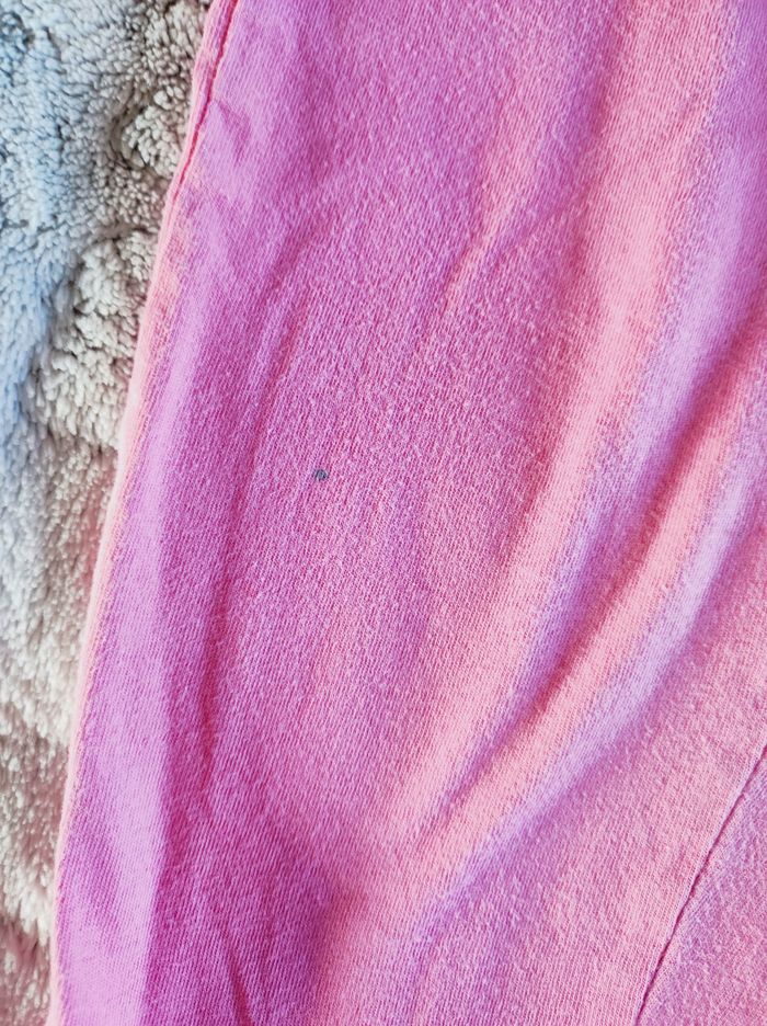 Porté, en bon état. Le dessin commence à légèrement craquer, il y a une tâche de stylo sur le pantalon à l'avant.