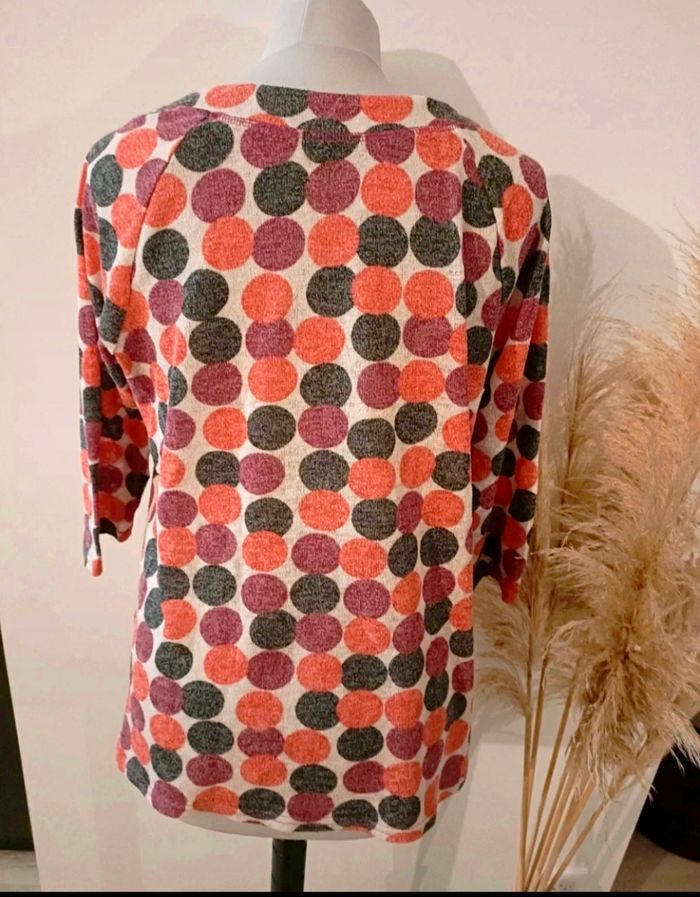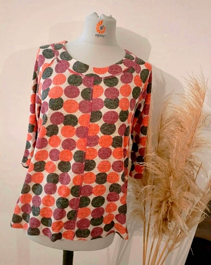 Pull léger avec motif rond Couleur crème ( rond : violine - orange- noir ) Taille 4 ( je pense à un 42) Pull assez long Sans marque Dimensions -Epaule : 32 cm - Poitrine : 53cm - hanche 55 cm - longueur : 63cm #adou49adulte