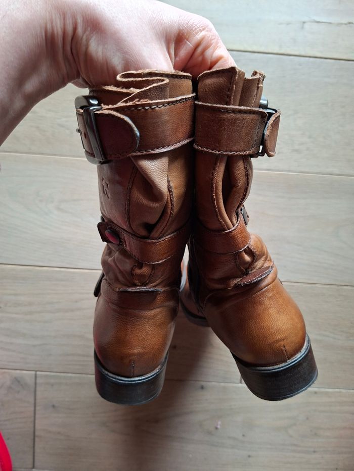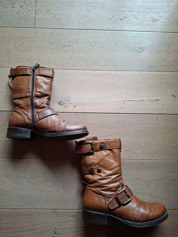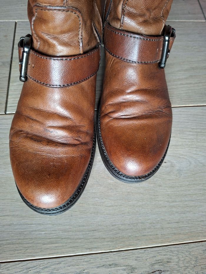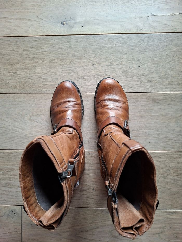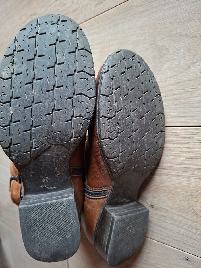 Bottines en cuir de qualité Dream in Green coloris camel. Pointure 39. Fermeture par zip. Cuir patiné. Vendues actuellement 149€.