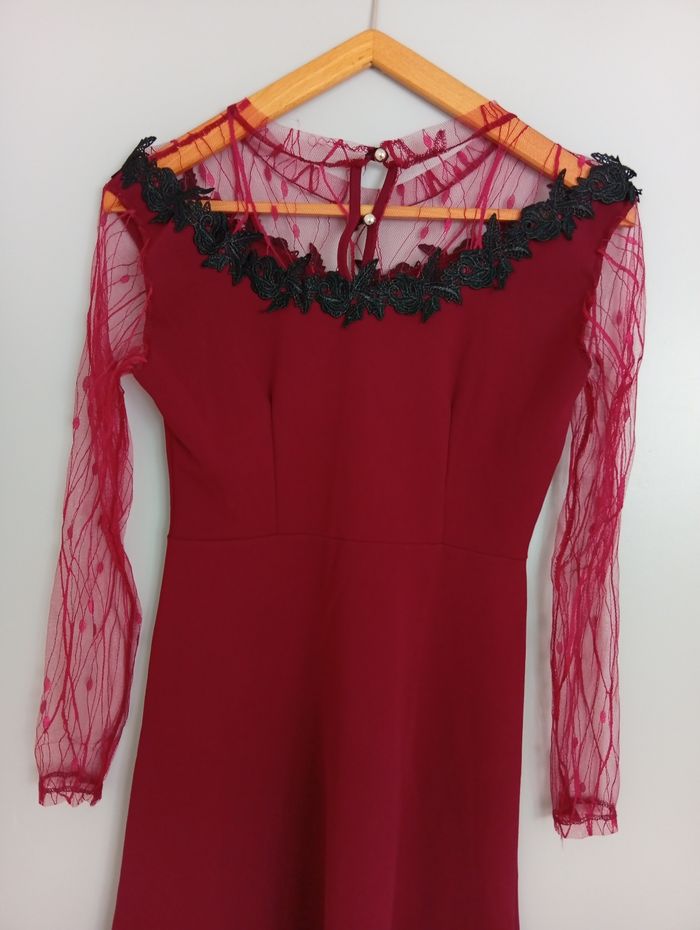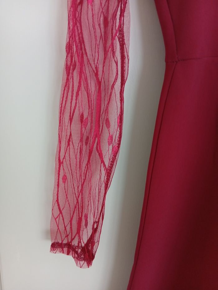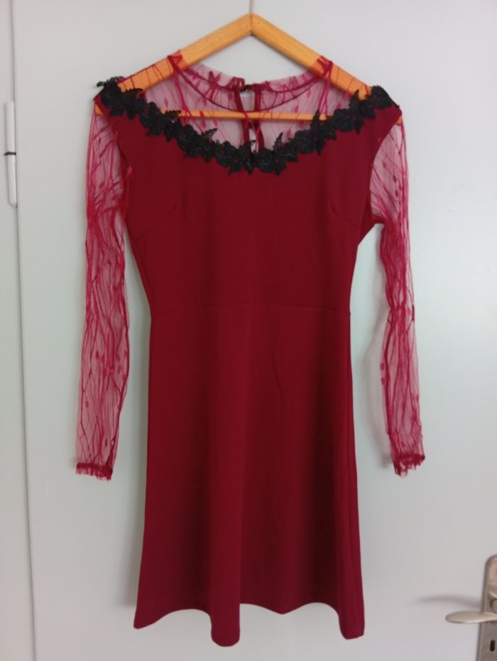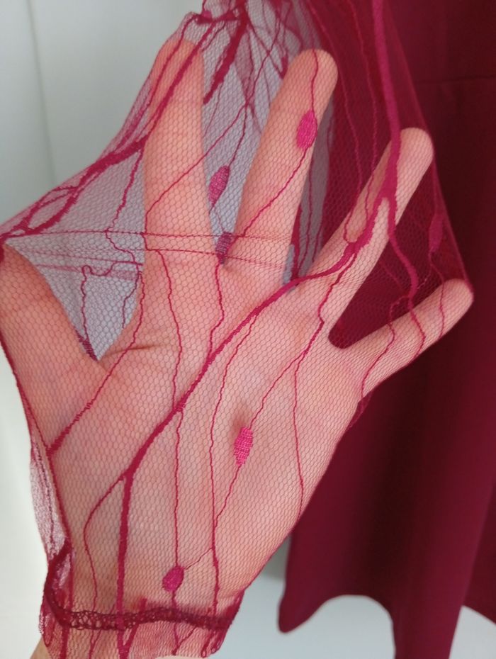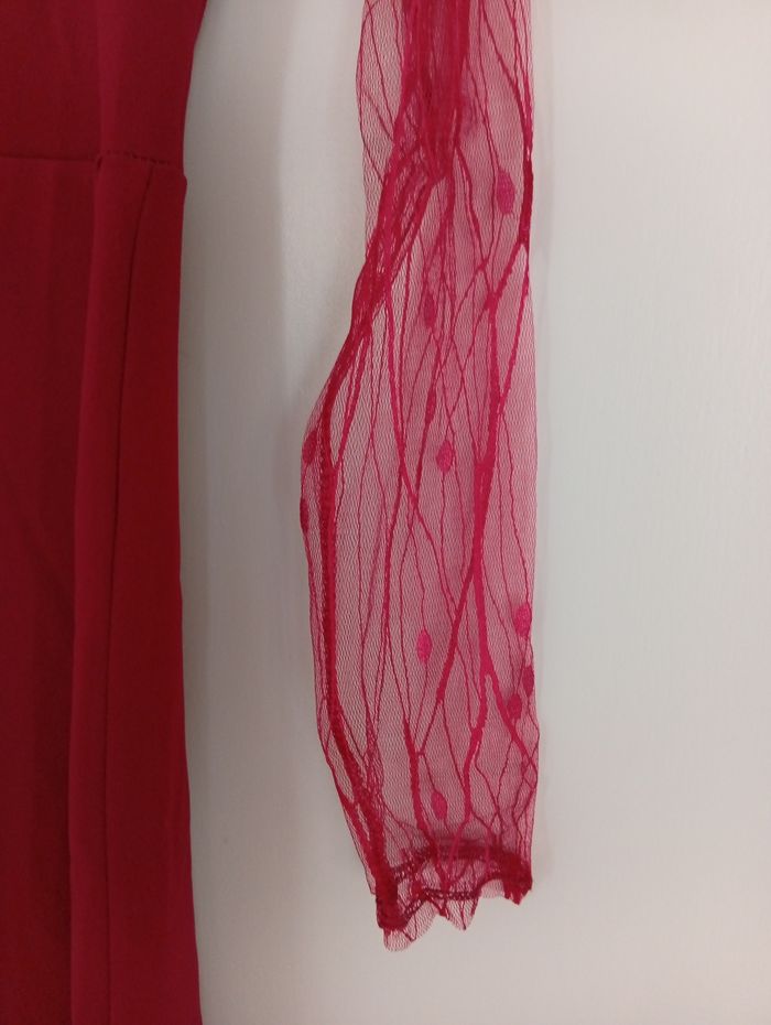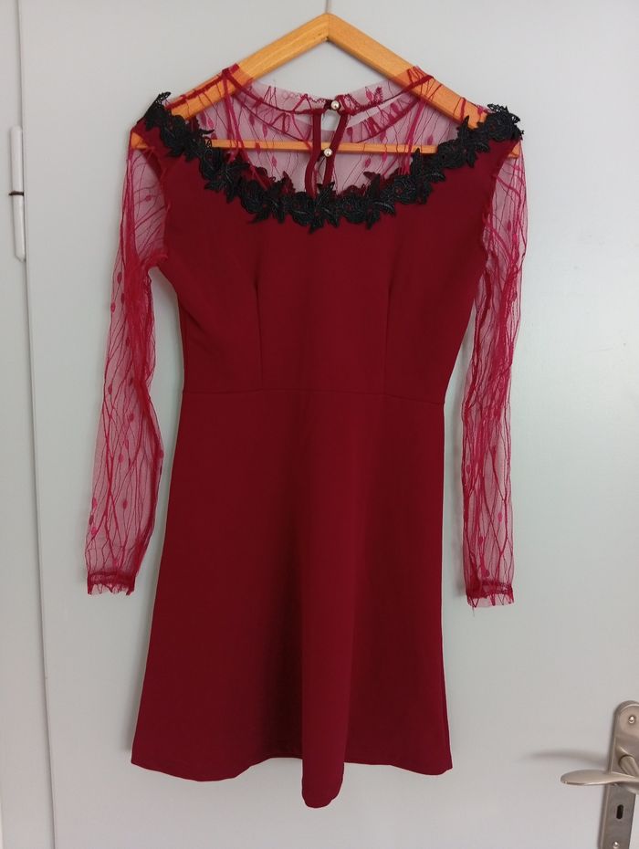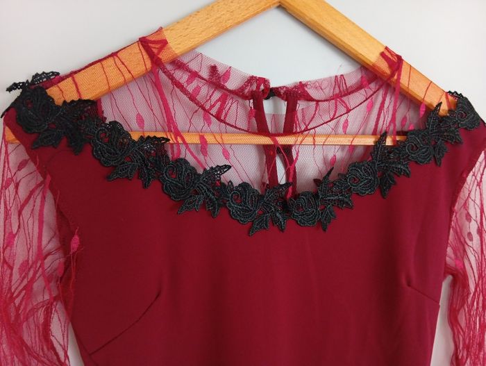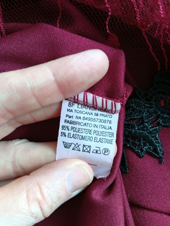 Polyester, élasthane. Taille estimée. Je pourrai mesurer. Jolie dentelle noire. Jolies manches en résille. C12