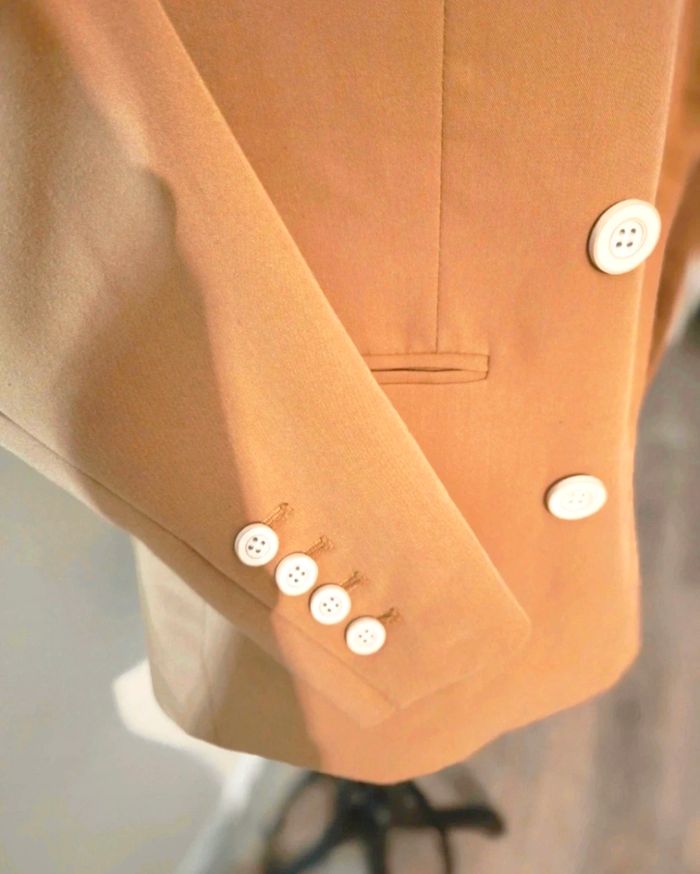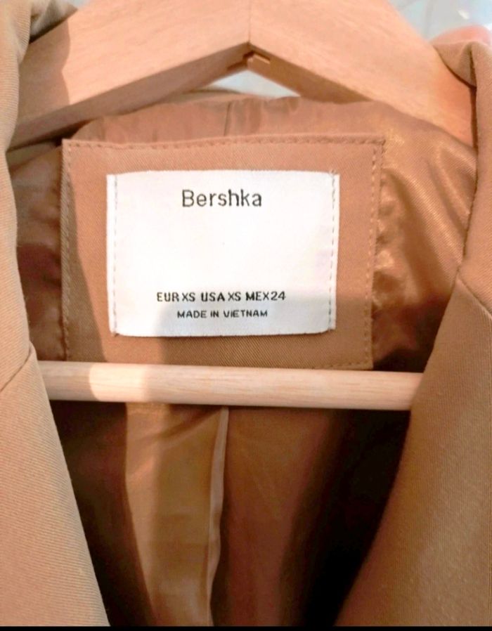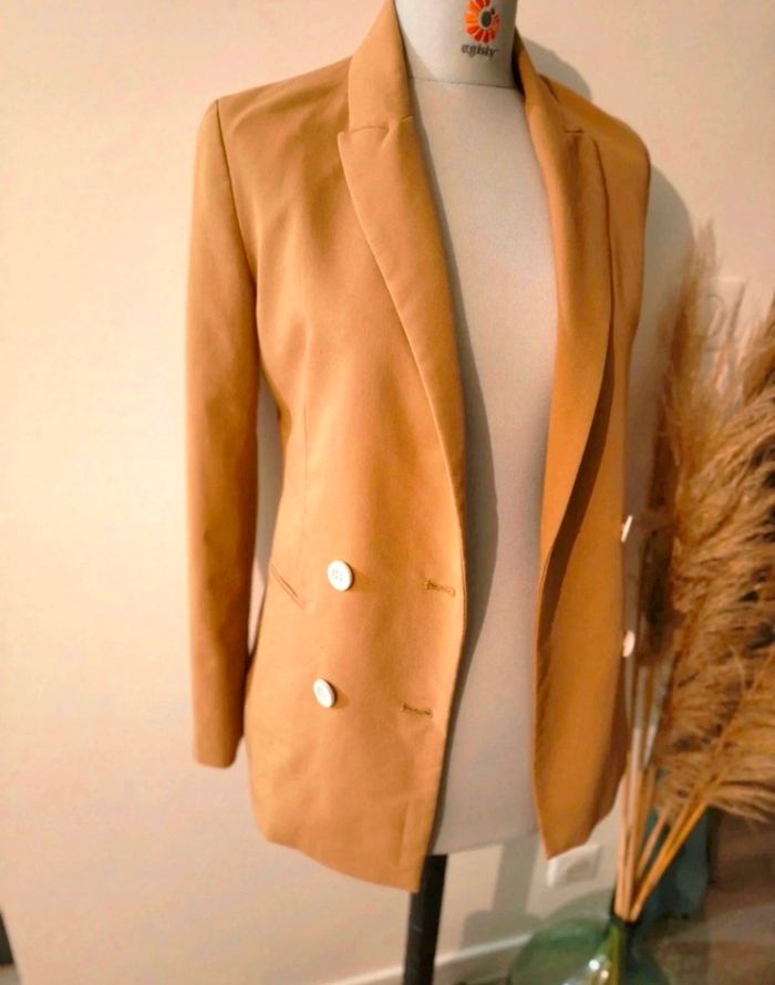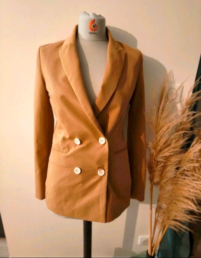 Blazer camel 4 boutons blancs sur le devant Deux poches Taille XS Marc Bershka Très bon état Dimension : Épaule à épaule : 38 cm Aisselle à aisselle : 45 cm Plus haut du blazer en bas : 69 cm #adou49adulte