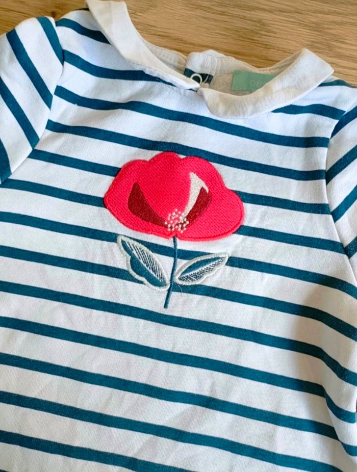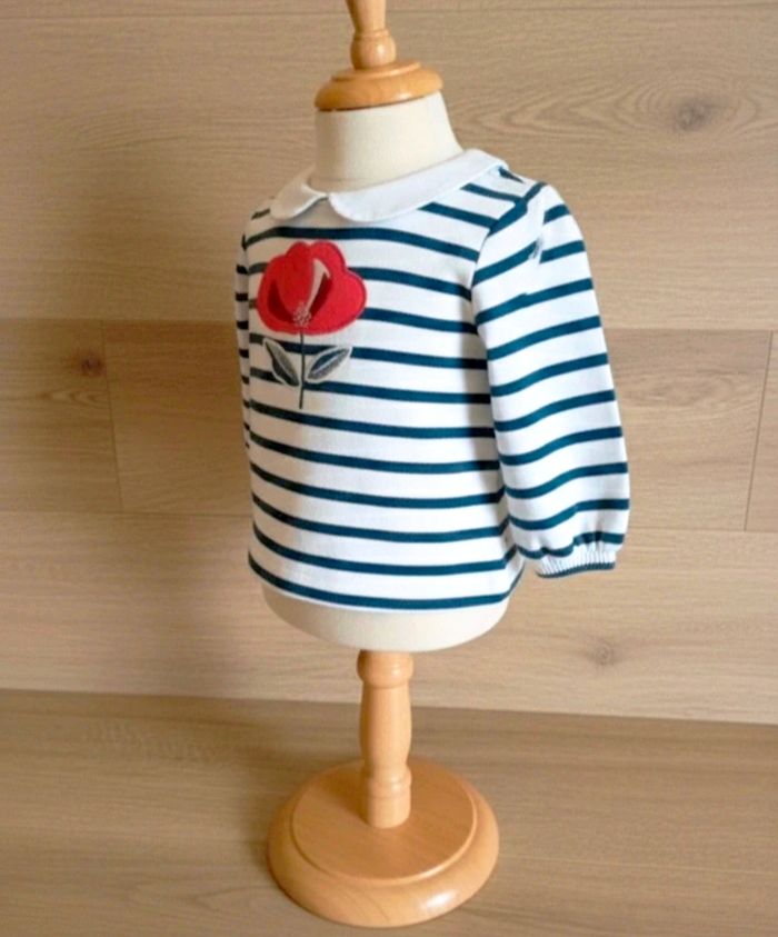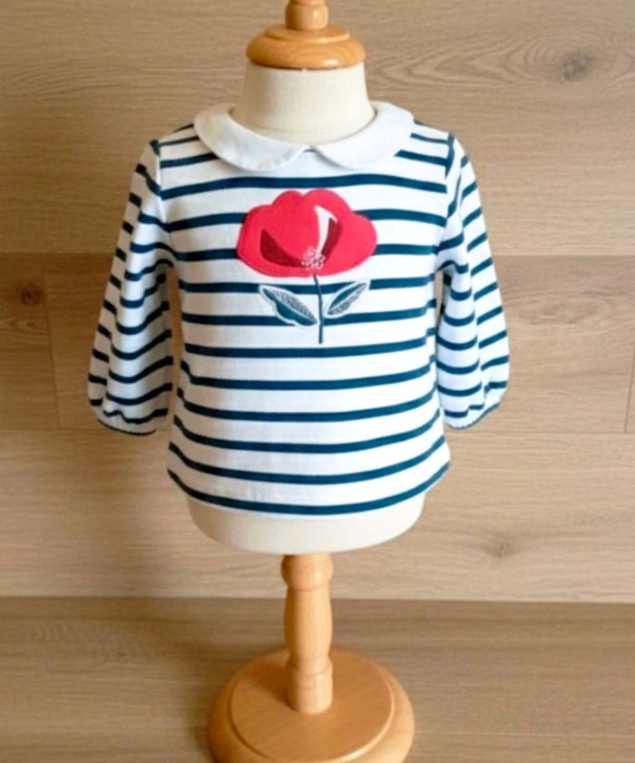 Pull marinière bleu foncé et blanc avec motif fleur. Taille 1 an Marque obaïbi Photo mannequin non contractuelle ! #adou49taille1an #adou49okaidi #adou49obaibi