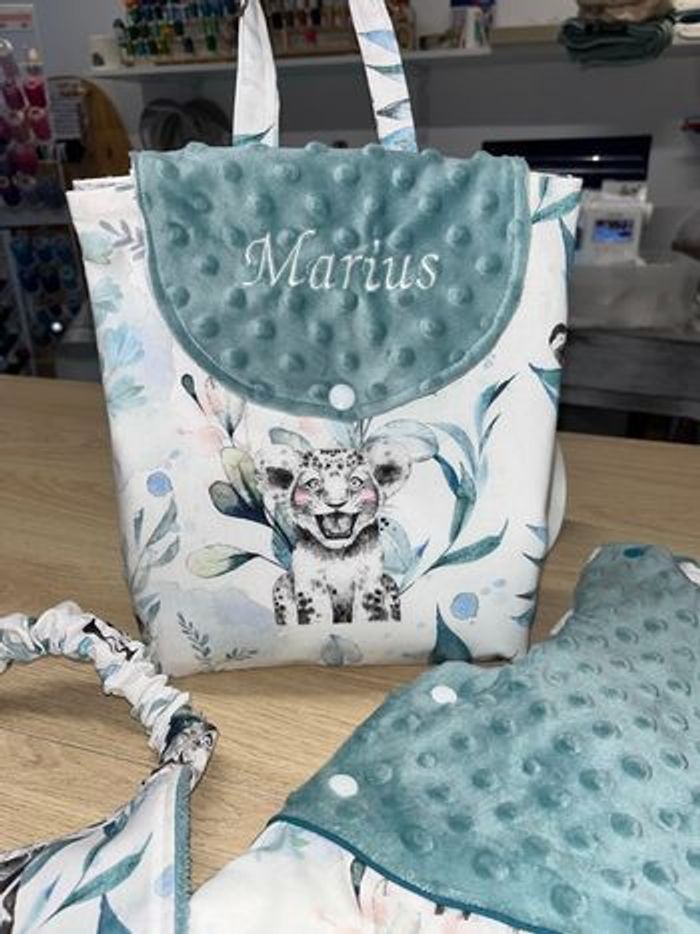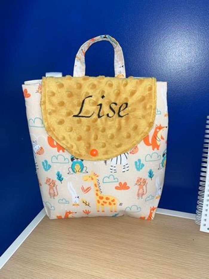 Sac à dos fait main sur commande délais 2/3 jour 2 façon 1 tissu imprimé au choix en bas rabat uni 2 tissu tout doux mincky en bas rabat imprimé Prénom brodé