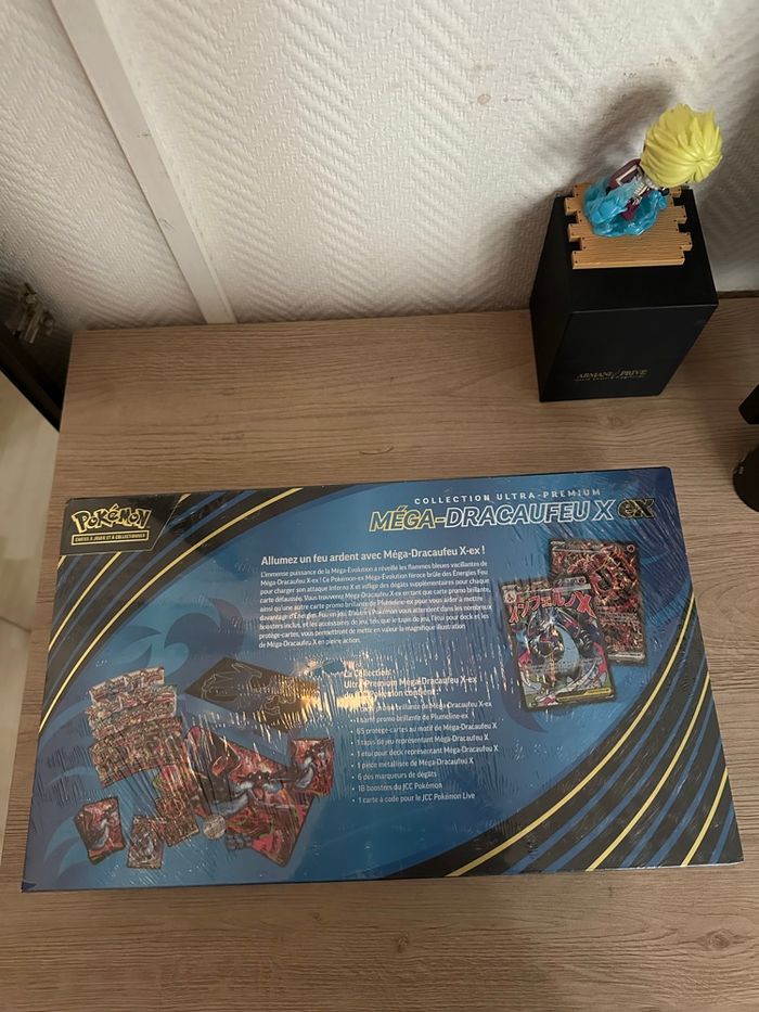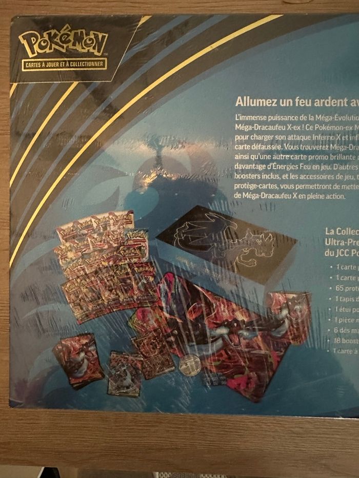 UPC Pokémon Méga-Dracaufeu X-ex (ME2) - Scellée / Neuve - UPC ME2 - échange contre display et/ou carte One piece teg possible Neuve, jamais ouverte et scellée d'origine. Contenu complet du coffret : • Boosters (18 au total) : • 4 × EVO2 - Évolutions à Paldea • 4 × EV03 - Flammes Obsidiennes • 2 × EV09 - Aventures Ensemble • 4 × ME01 - Méga-Évolution • 4 × ME02 - Flammes Fantasmagoriques * Cartes promo exclusives : • Méga-Dracaufeu X-ex (promo) • Plumeline-ex (promo) Accessoires premium : • 1 tapis de jeu (playmat) Méga-Dracaufeu X • 1 deck box assortie • 65 protège-cartes (sleeves) • 1 pièce métallisée • 6 dés marqueurs de dégâts • 1 carte code JCC Pokémon Live *Details: • Produit officiel Pokémon TCG • État : Neuf / Scellé • Envoi rapide et soigné • Photos supplémentaires sur demande