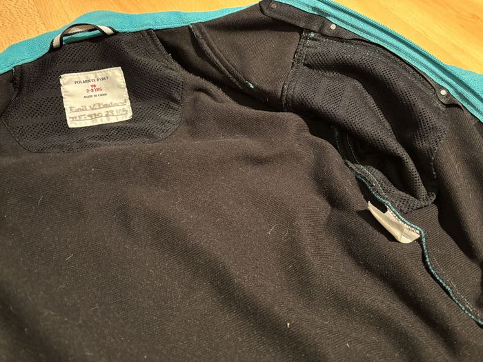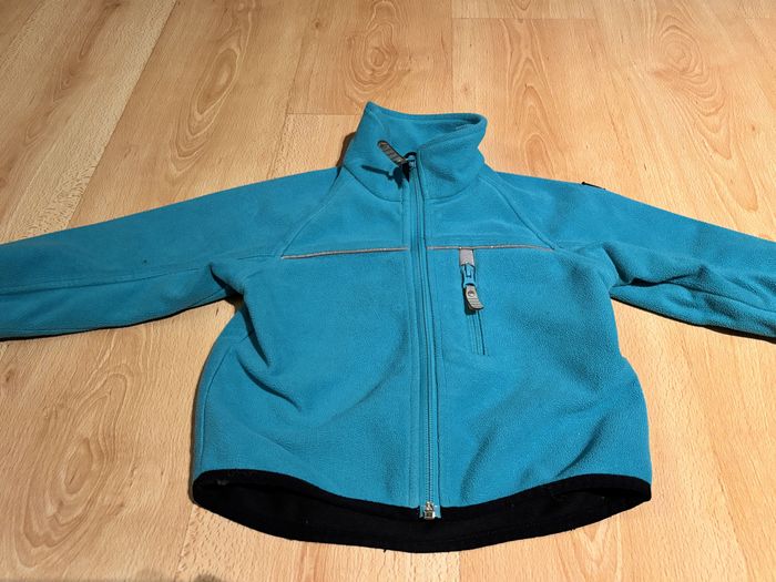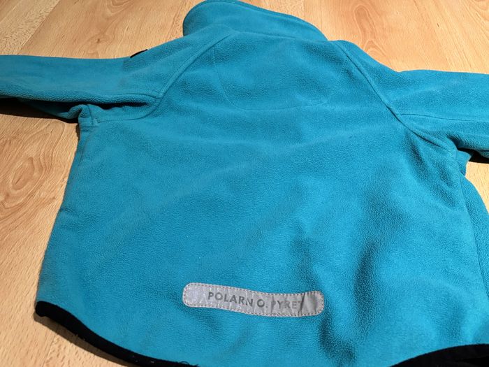 Cette veste polaire de la marque suédoise Polarn O. Pyret est épaisse et fait office de coupe-vent chaud pour l´entre-saison. La marque Polarn O. Pyret est connue et reconnue pour ses vêtements de qualité. Elle a été utilisée par deux enfants avant les nôtres et elle n´a toujours pas bougé. Elle taille assez petit (je dirais plutôt un 92).
