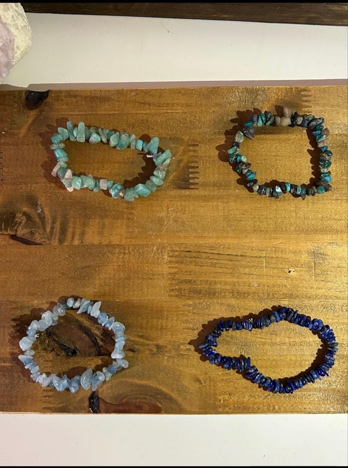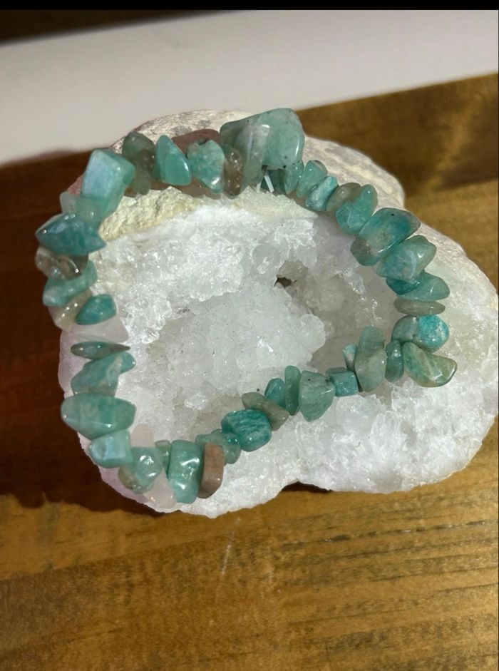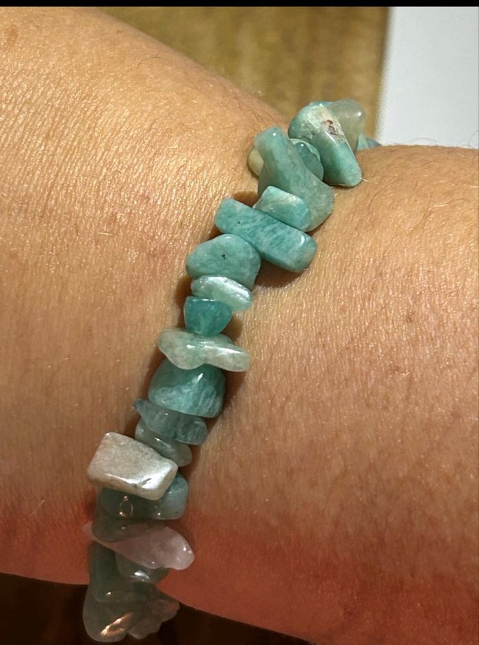 Bracelet baroque composé de véritables éclats d’amazonite naturelle, montés sur un fil ajustable afin de convenir à toutes les tailles de poignet. Chaque pierre présente des nuances de vert d’eau à bleu doux, rendant chaque bracelet unique.