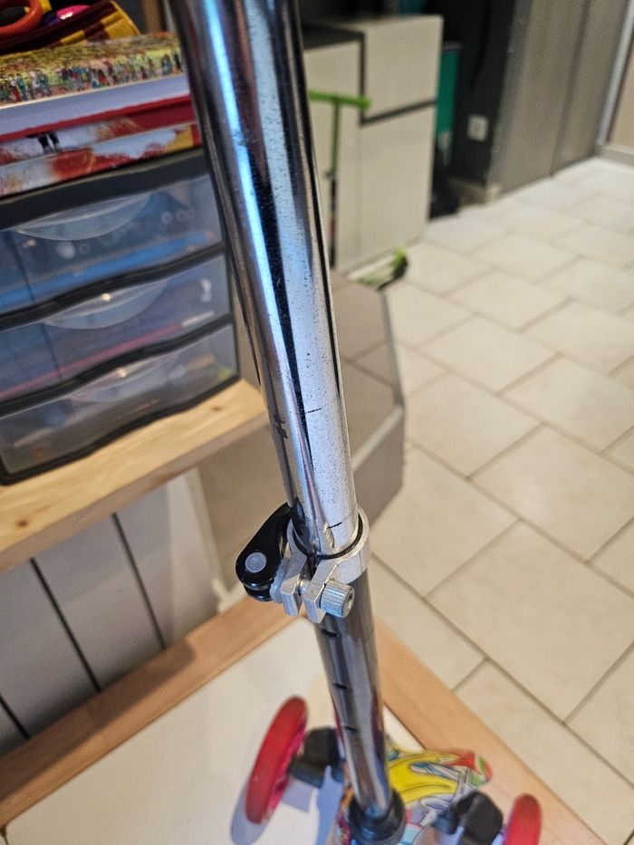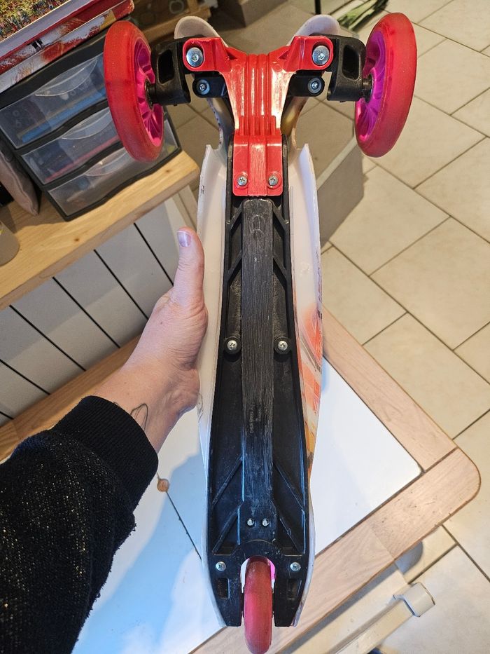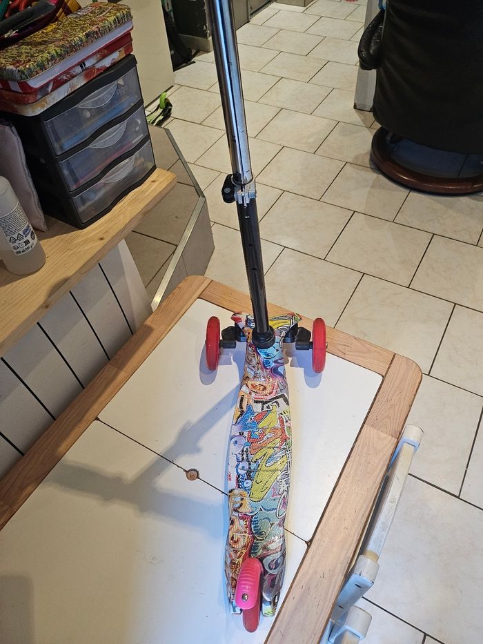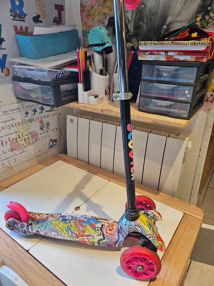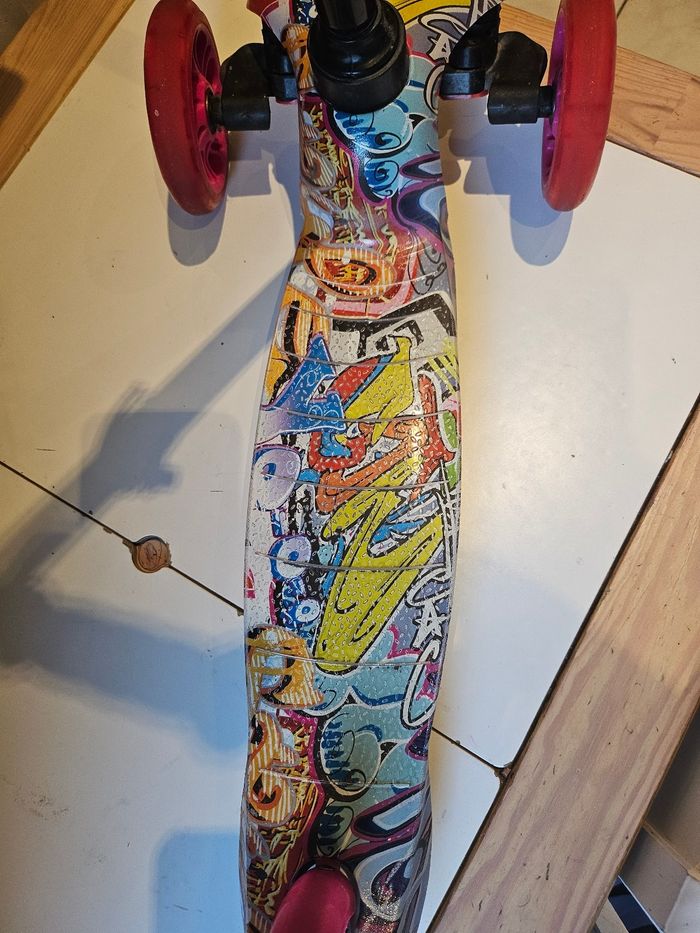 Trottinette trois roues ( Deux devant et une derrière). Effet graffiti. Frein à pied. Guidon réglable. Couleur un peu passée à certains endroits. Marque: Scooter